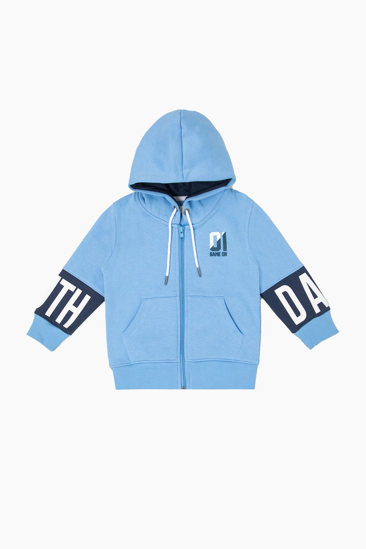 Zipper hoodie in fleece fabrication, featuring drawcorded hood, kangroo pocket and print on contrasting sleeve panels