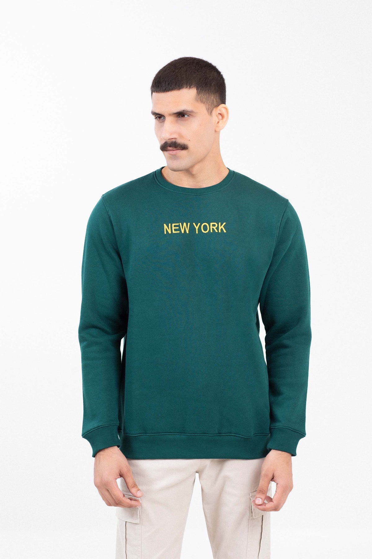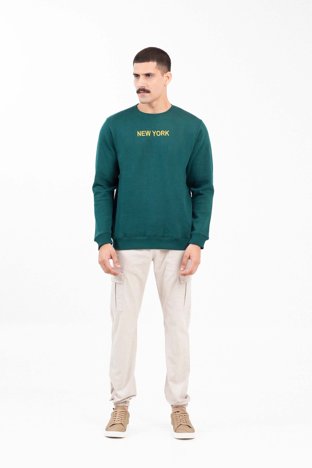 Comfort fit sweatshirt in fleece fabrication, featuring crew neck with embroidery in front and print at back