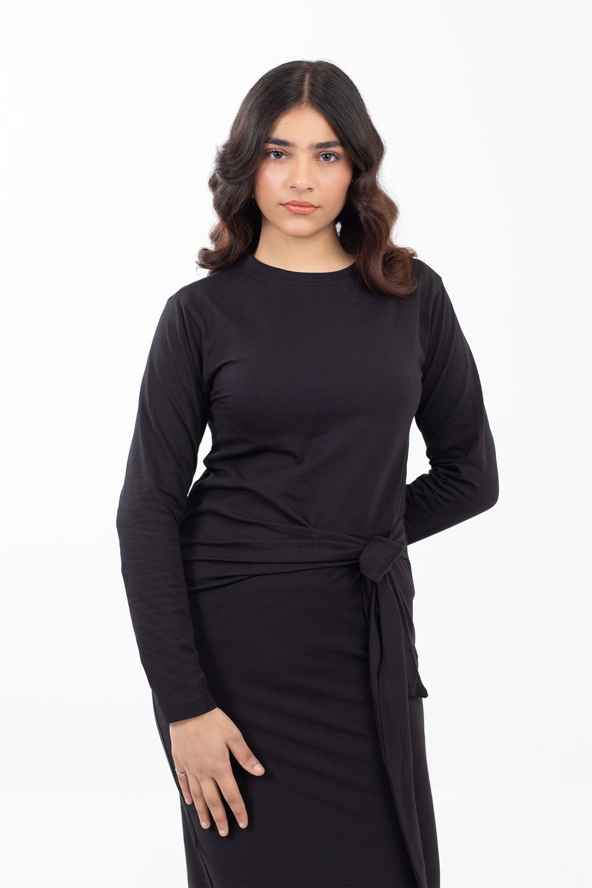 Crew neck dress in lurex jersey, featuring long sleeves and tie up detailing in front with side slit