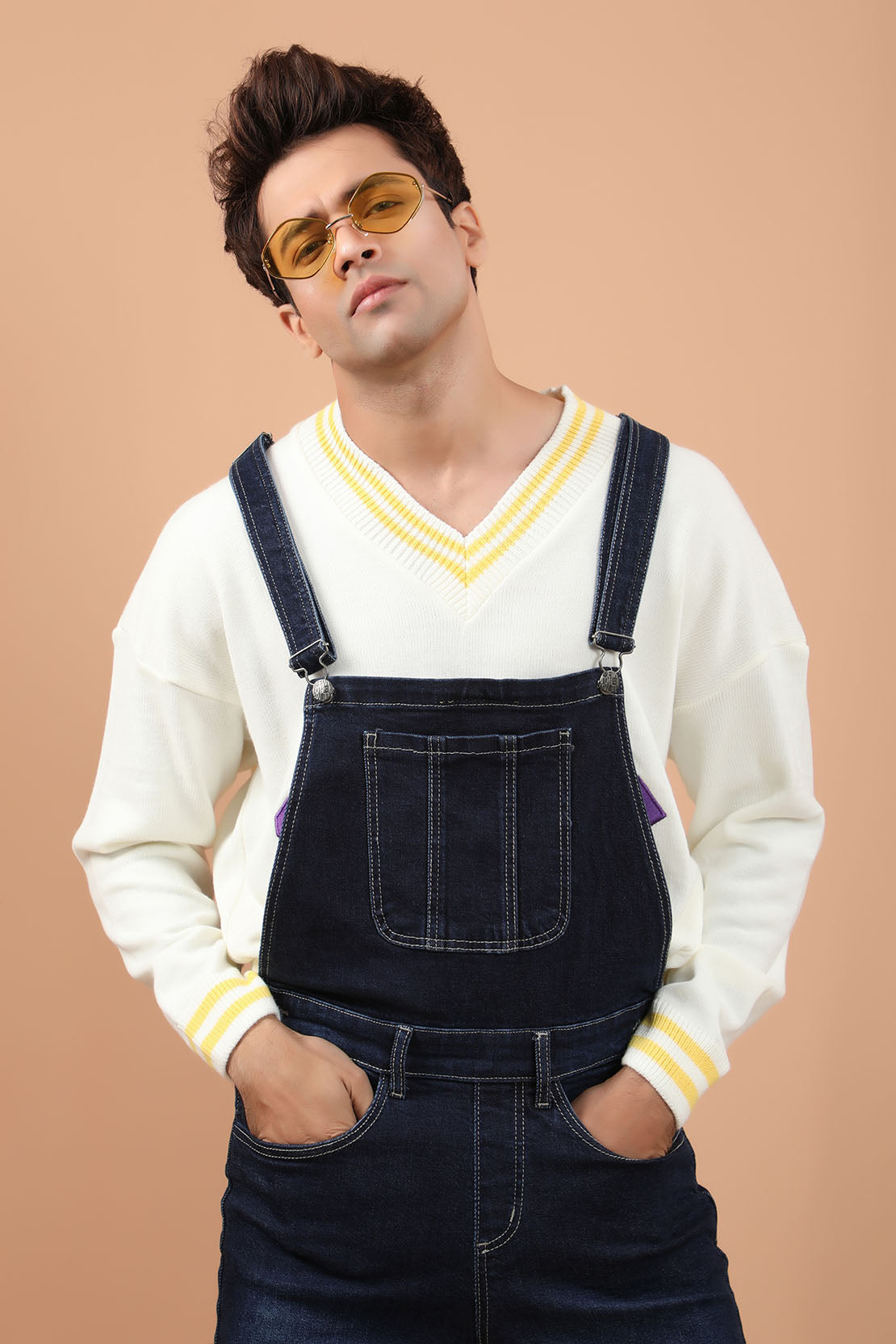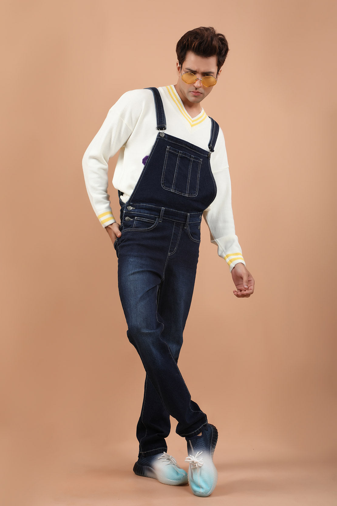 Denim dungarees, featuring buckled straps and side buttoned opening