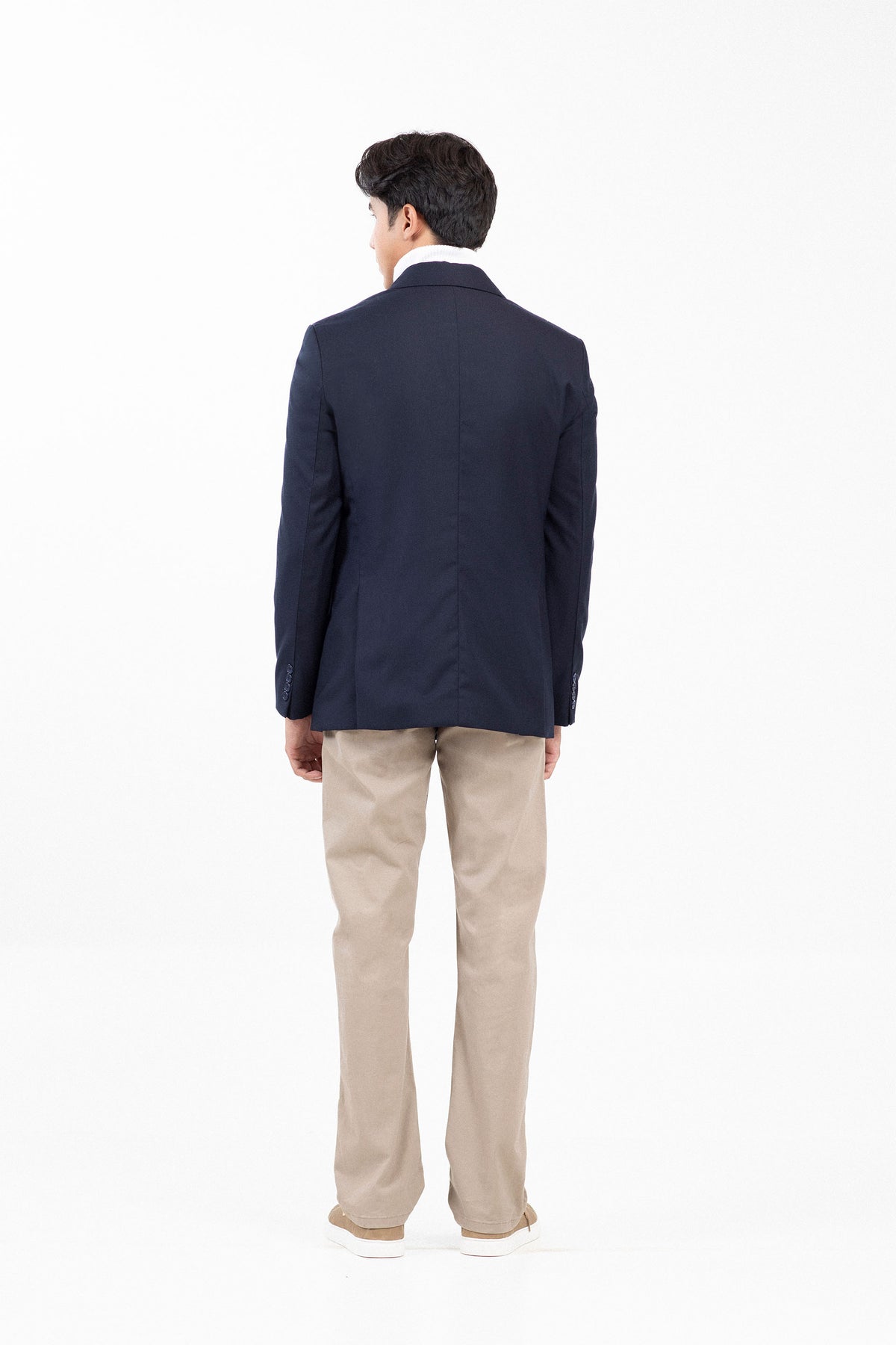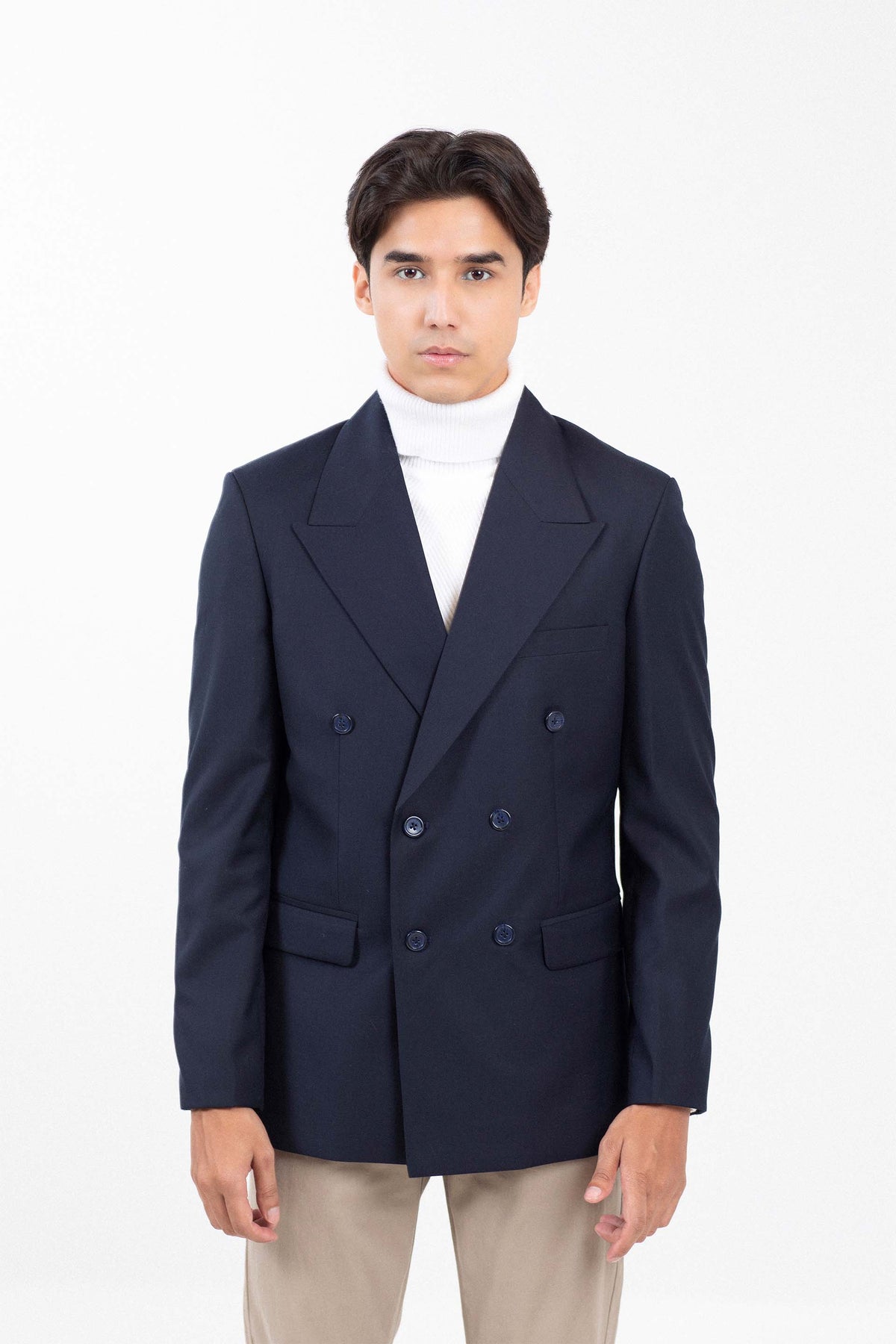 Double breast blazer in suiting fabrication, featuring notch collar and additional decorative buttons