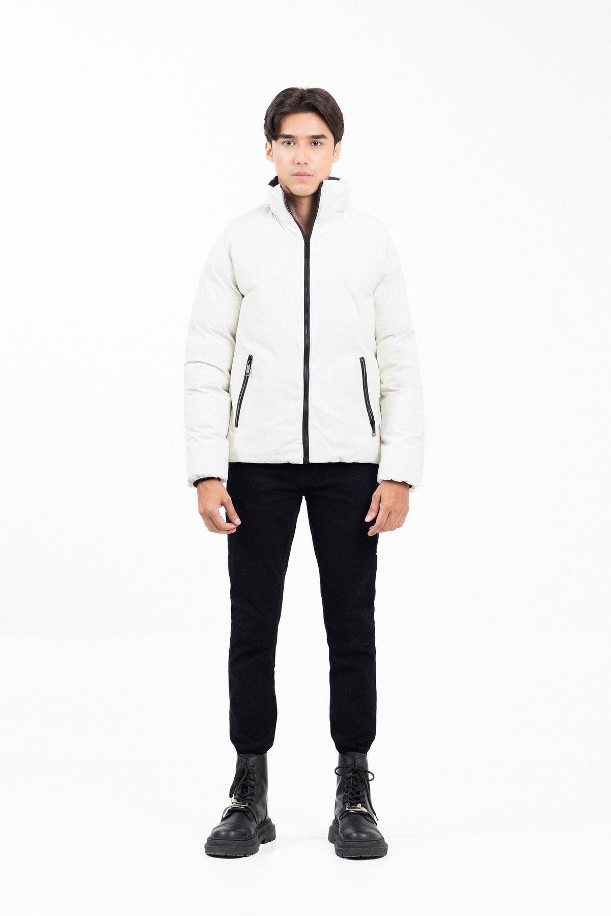 2-sided convertible puffer jacket in polyester fabrication, featuring mock neck and full front zip opening