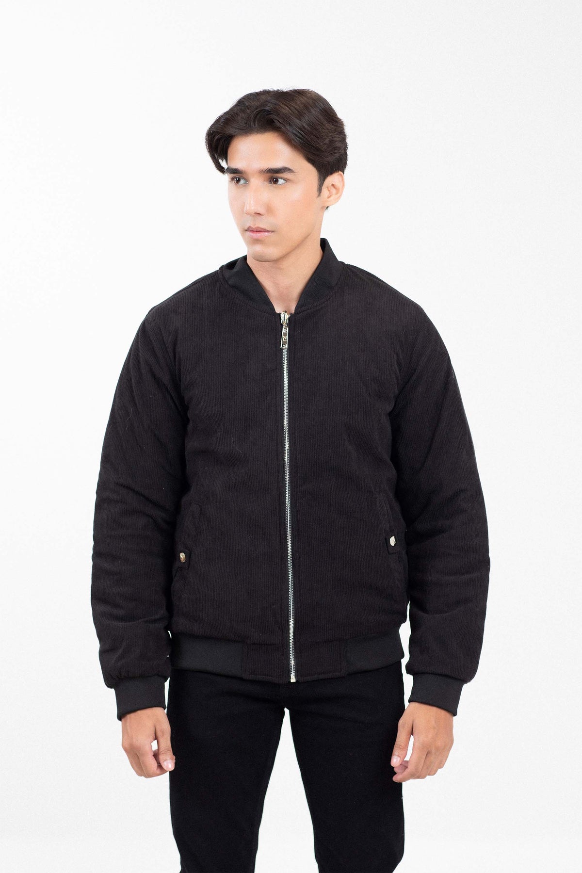 2-sided convertible jacket in corduroy fabrication, featuring rib neck, full front zip opening and quilted polyester on the other side
