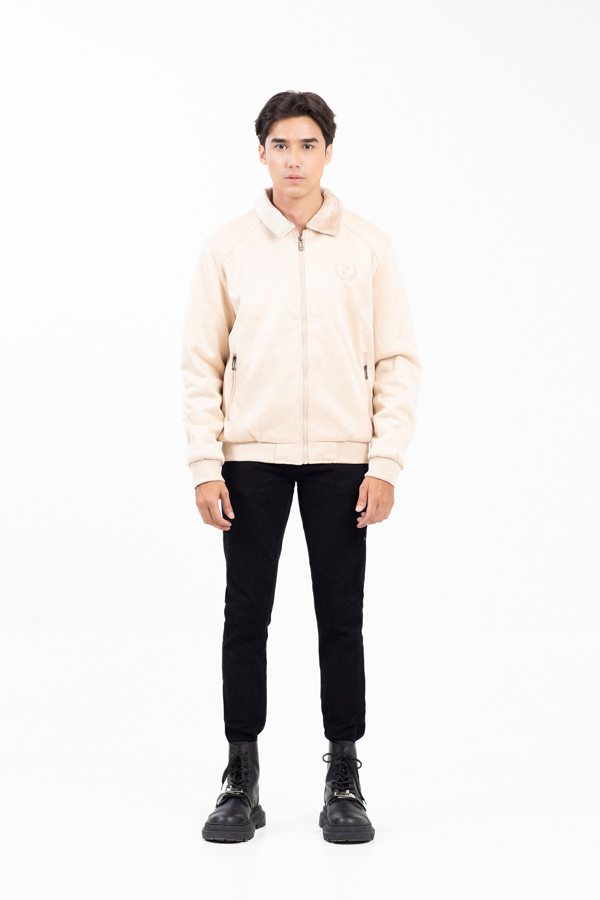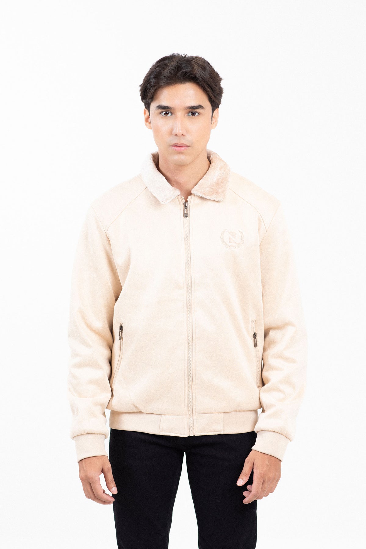 Aviator style jacket in faux suede fabrication, featuring sherpa collar with sherpa lining and full front zip opening