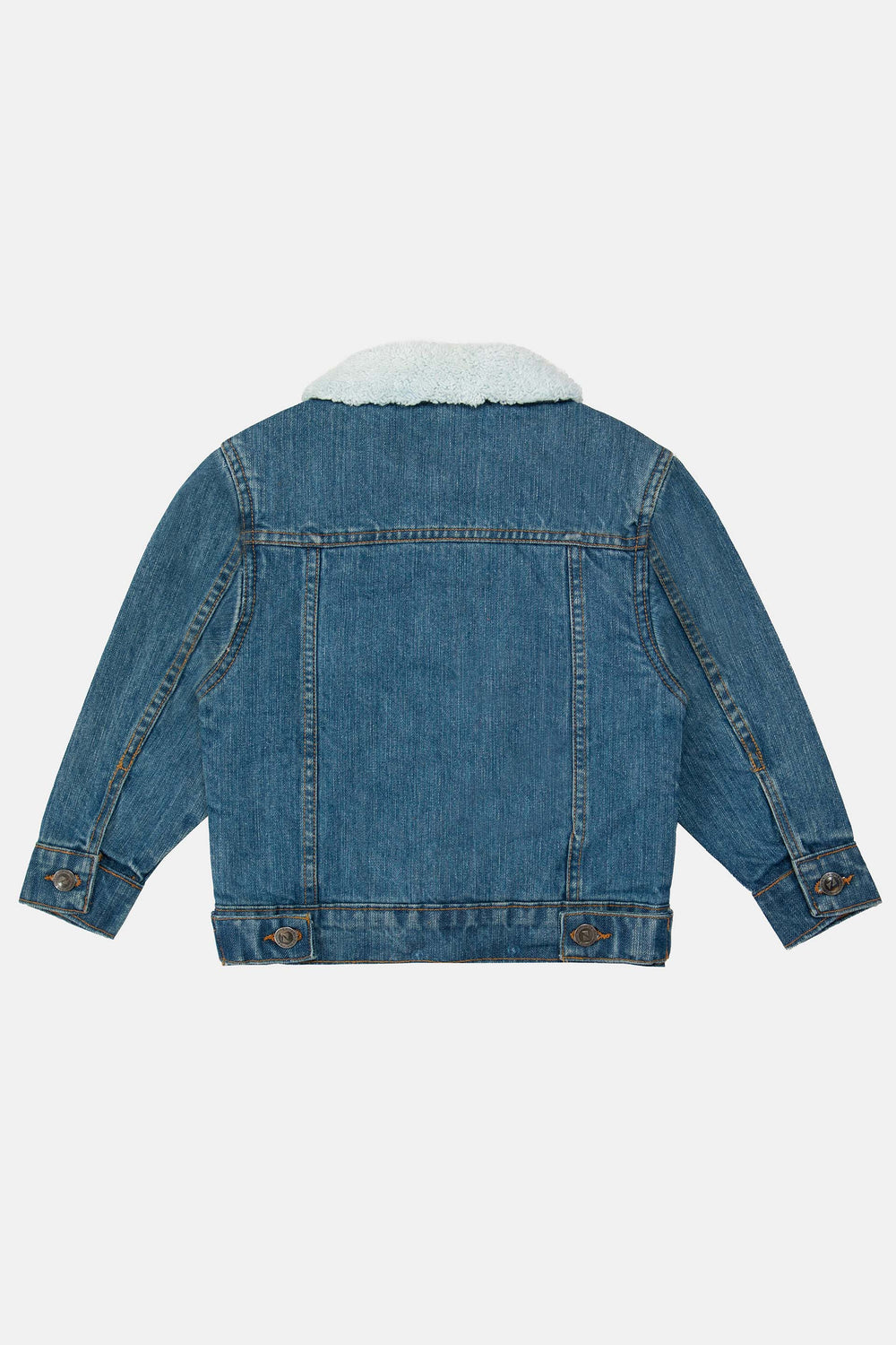 Basic denim jacket, featuring front buttoned placket, pockets, pannels with sherpa lining and collar