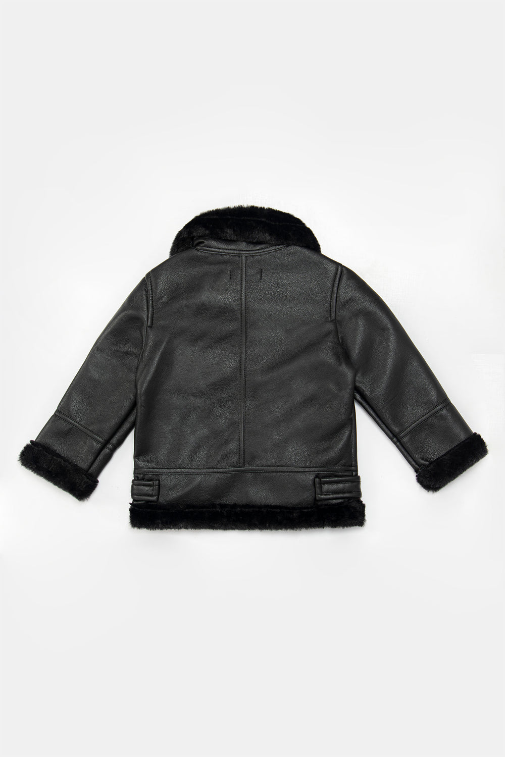 Faux leather biker jacket, featuring full front zip opening, pockets with faux fur collar and trims at hem and sleeves