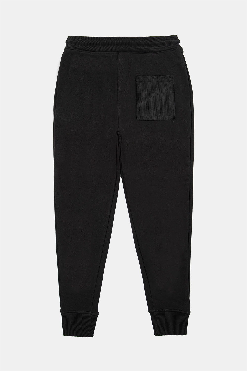 Track pants in terry fabrication, featuring drawcorded waist belt, side pockets and ribbed hem with print in front