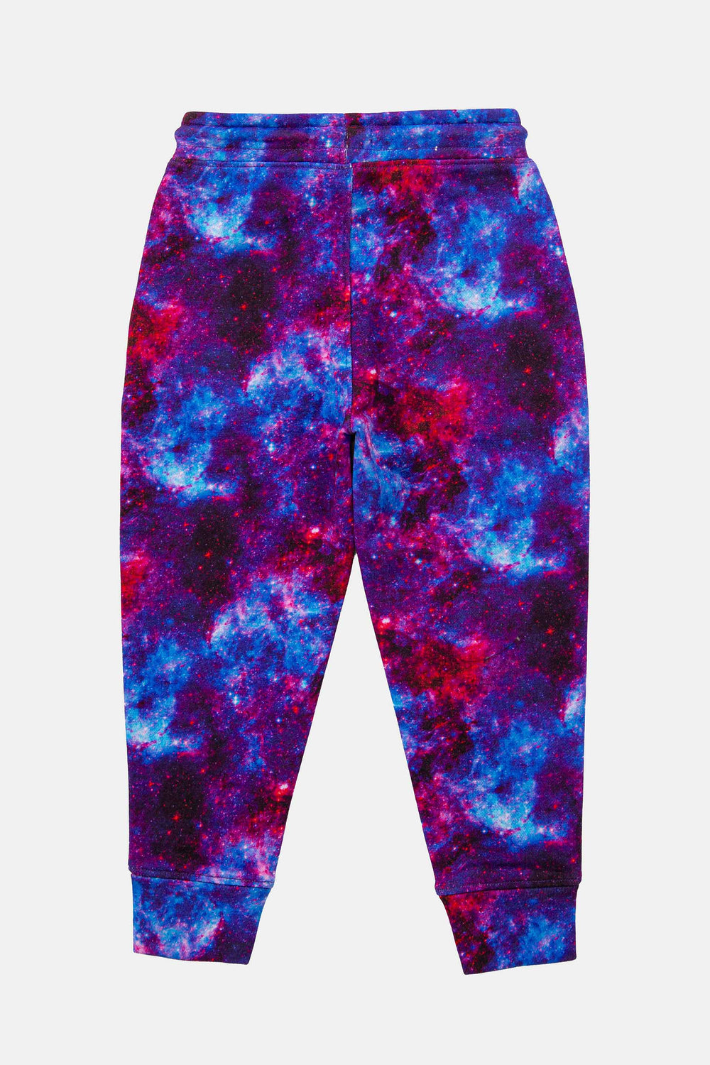 Printed track pants in terry fabrication, featuring drawcorded waist belt, side pockets and ribbed hem