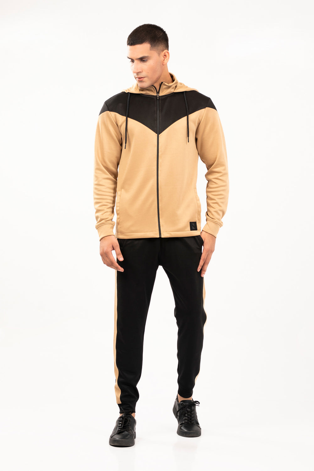 Mock neck zipper in interlock fabrication, featuring full sleeves and contrasting panels