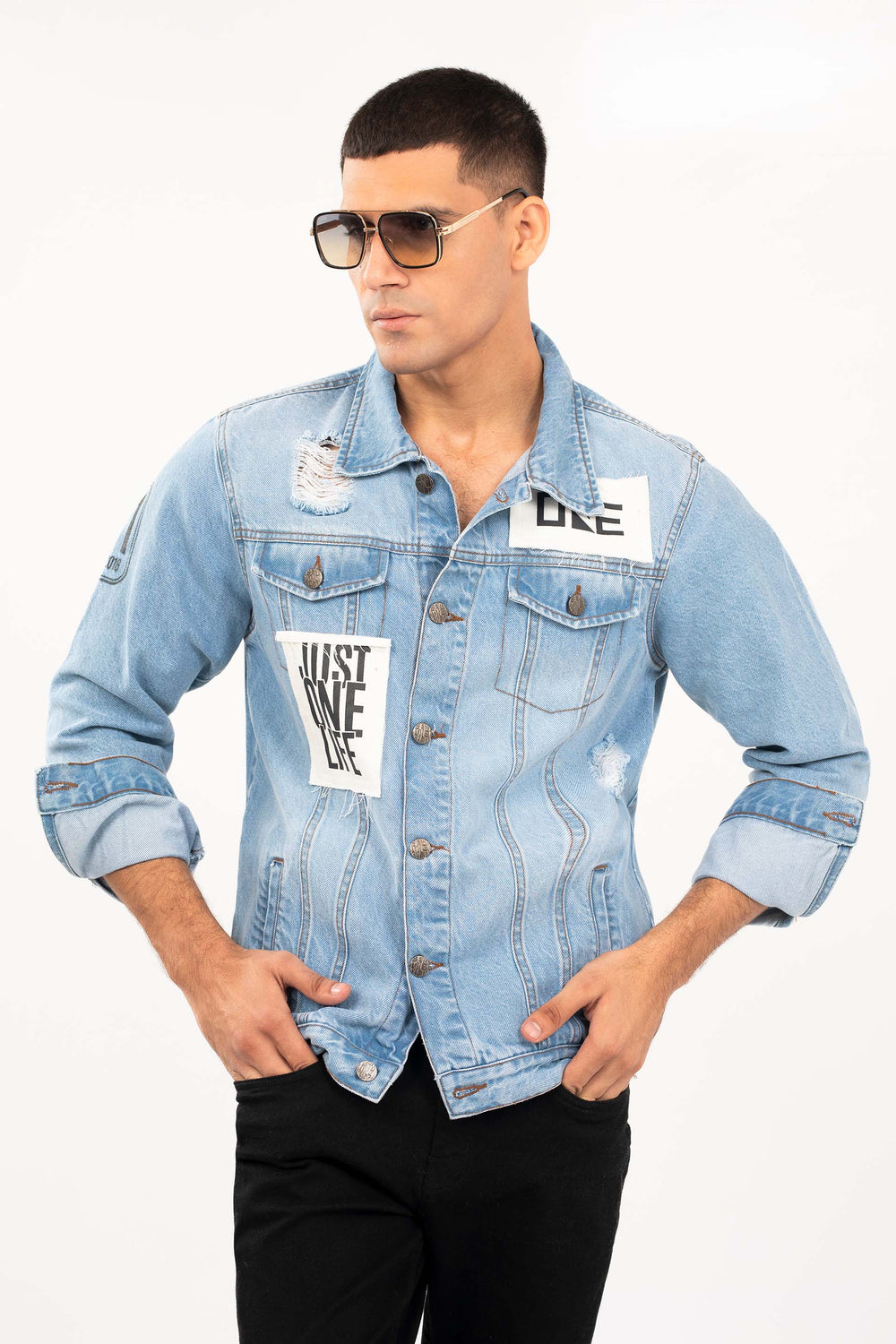 Denim jacket, featuring front buttoned placket, pockets, pannels with raw edged patches