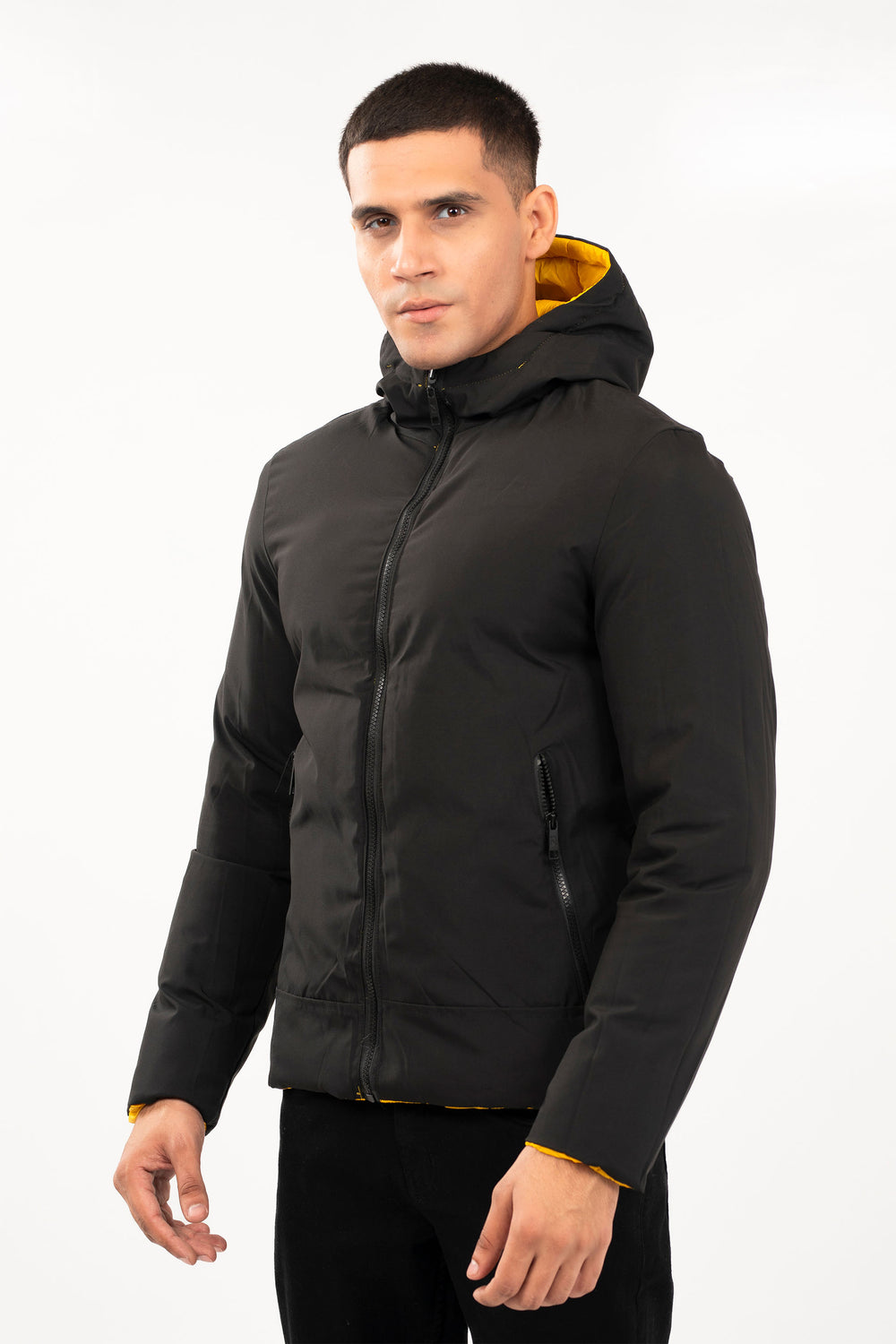 2-sided convertible puffer jacket in parachute fabrication, featuring hood, pockets and full front zip opening