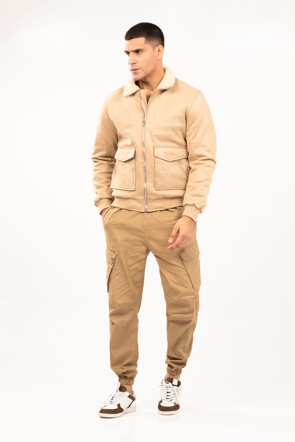 Faux suede jacket, featuring collar, full front zip opening and pockets in front with ribbed hem and cuffs