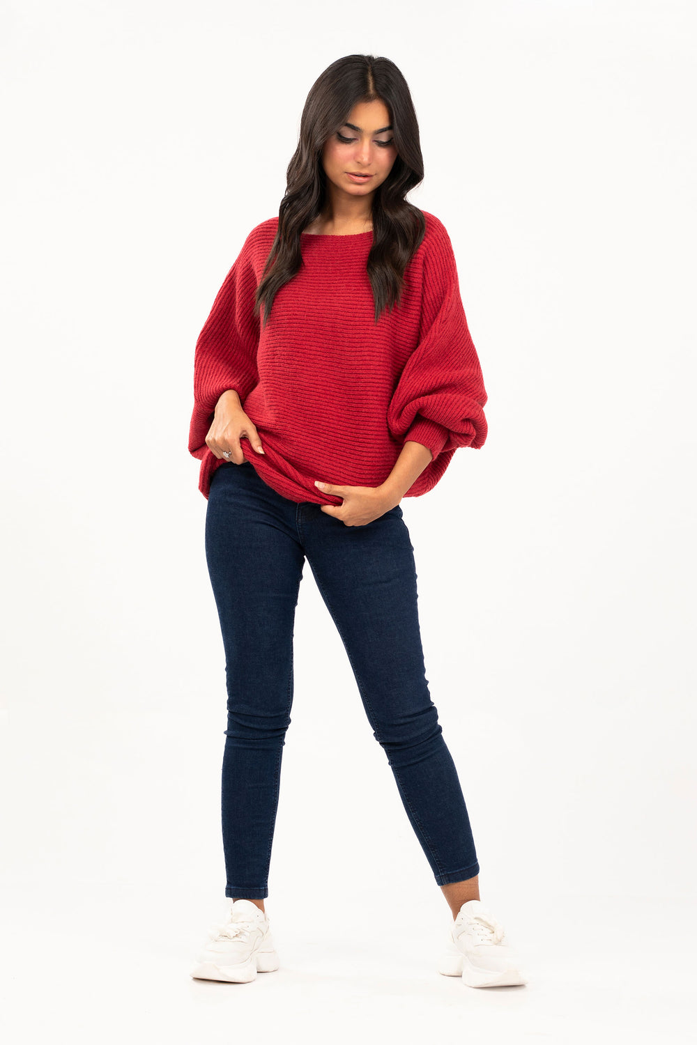 Baggy sweater in blended material, featuring boat neck and bishop sleeves