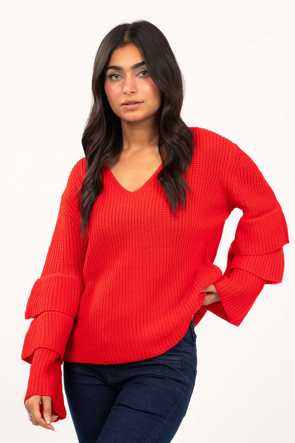 V-neck sweater, featuring an A-line shape and bell sleeves with multiple ruffles
