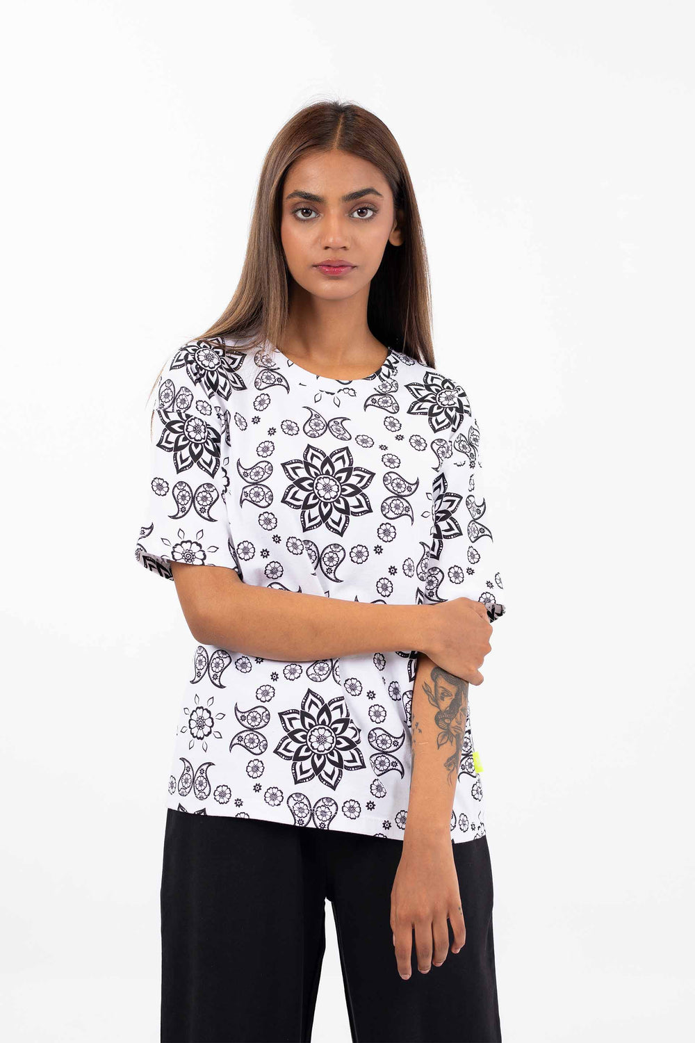 Round neck tee shirt in jersey fabrication, featuring drop shoulders, short sleeves and print in front