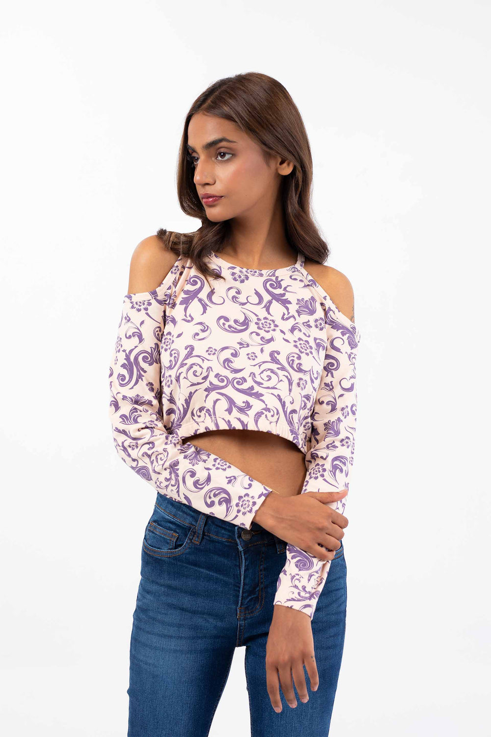 Cropped top in printed jersey fabrication, featuring cut out sleeves, Elasticated hem and long sleeves