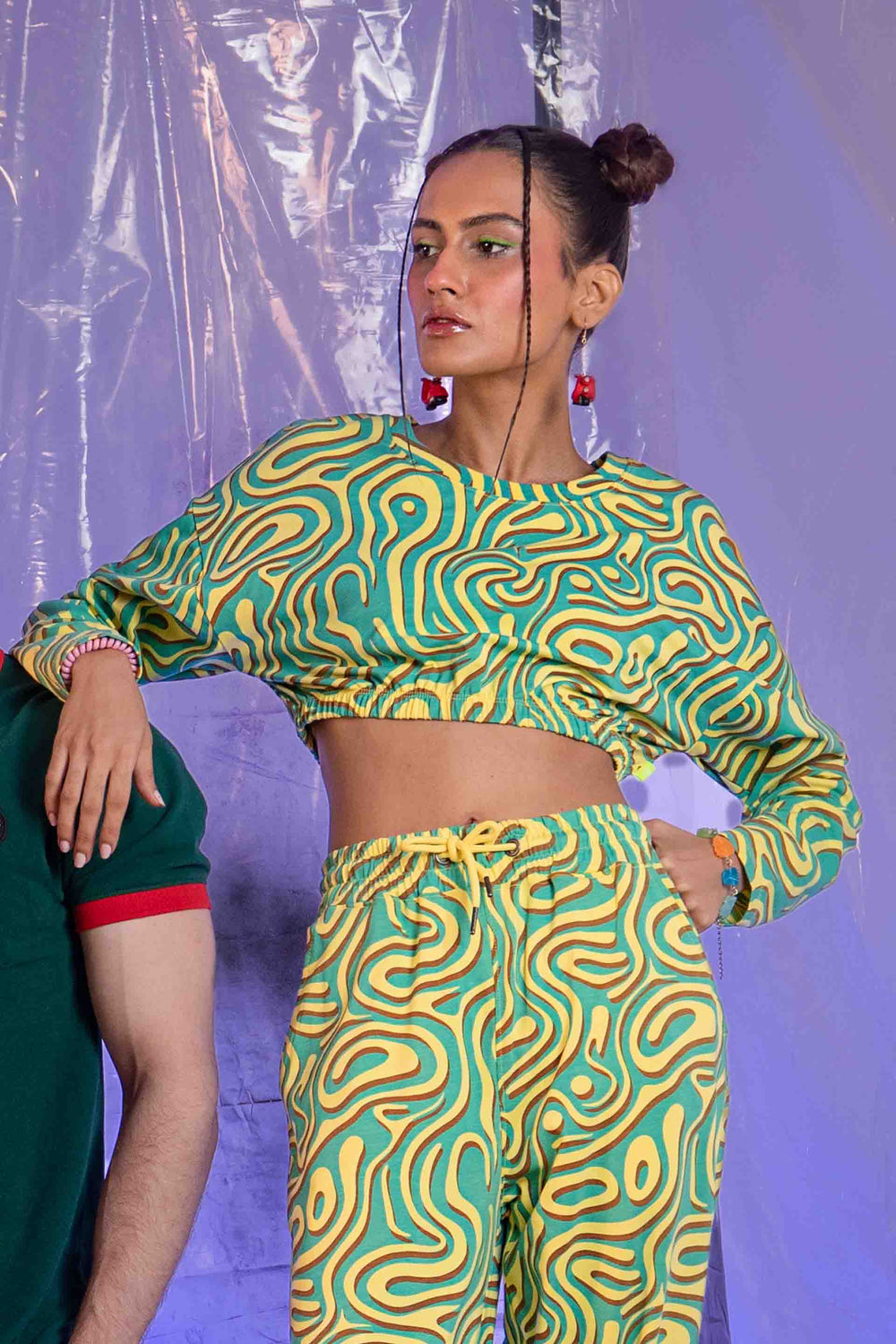 Cropped top in printed jersey fabrication, featuring round neck. Elasticated hem and long sleeves