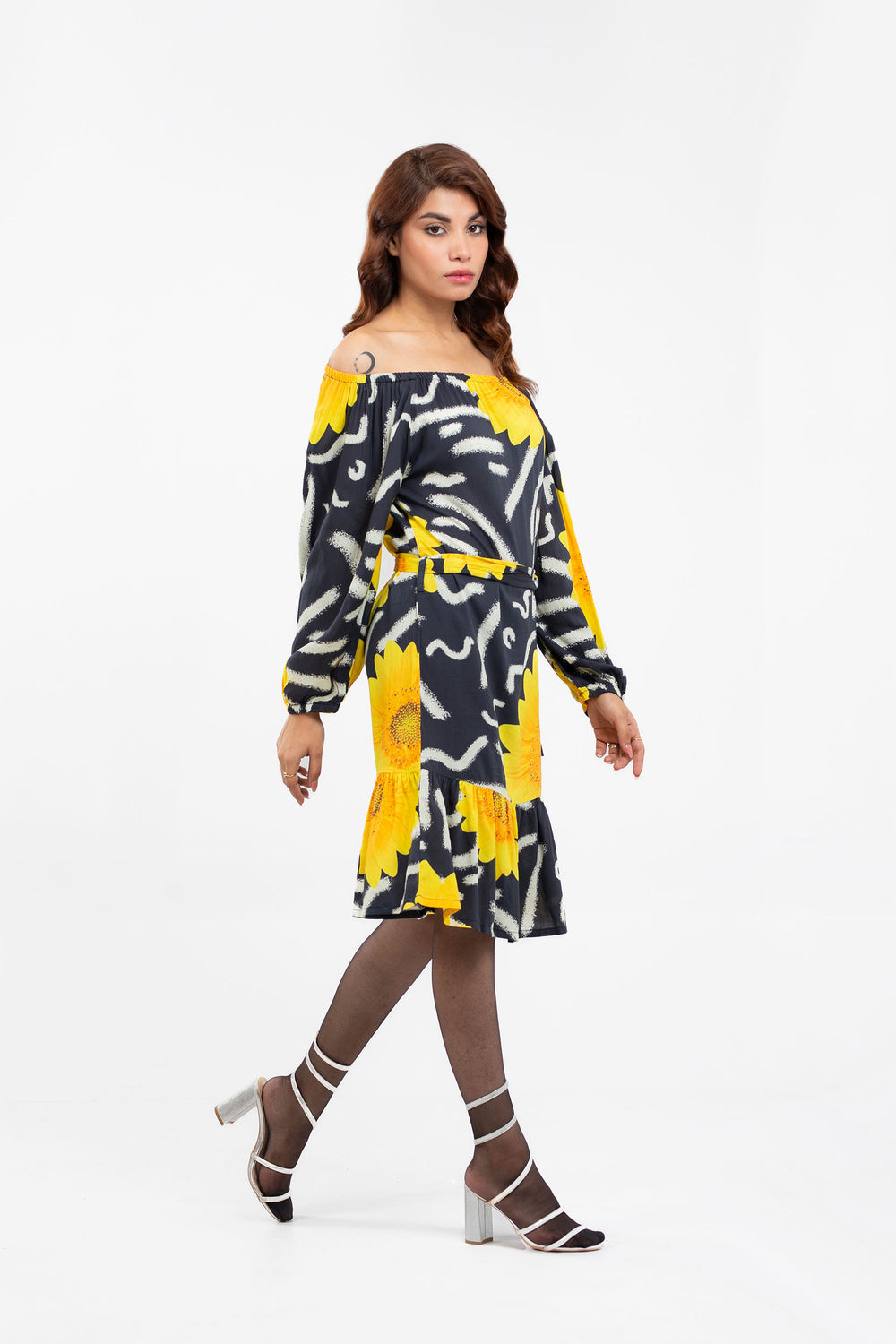Mid length Flared shirt, featuring off shoulder elasticated neck line and self fabric tie up waist belt