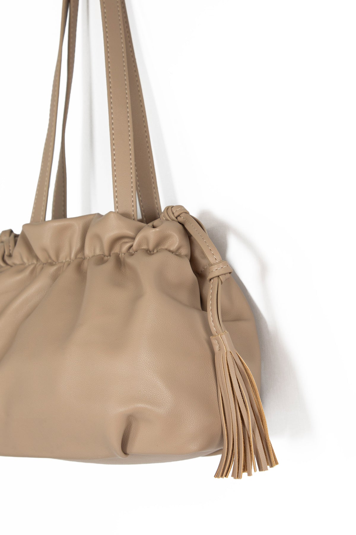 Faux leather pouch bag, featuring self strap and drawcord detailing