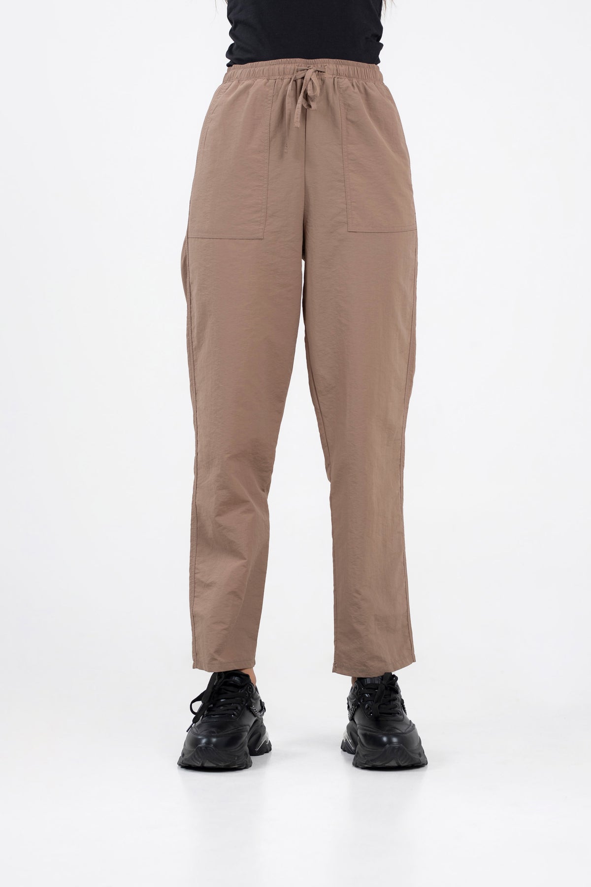 Straight leg trousers in cotton blend fabrication, featuring elasticated waist belt with drawcord and front patch pockets