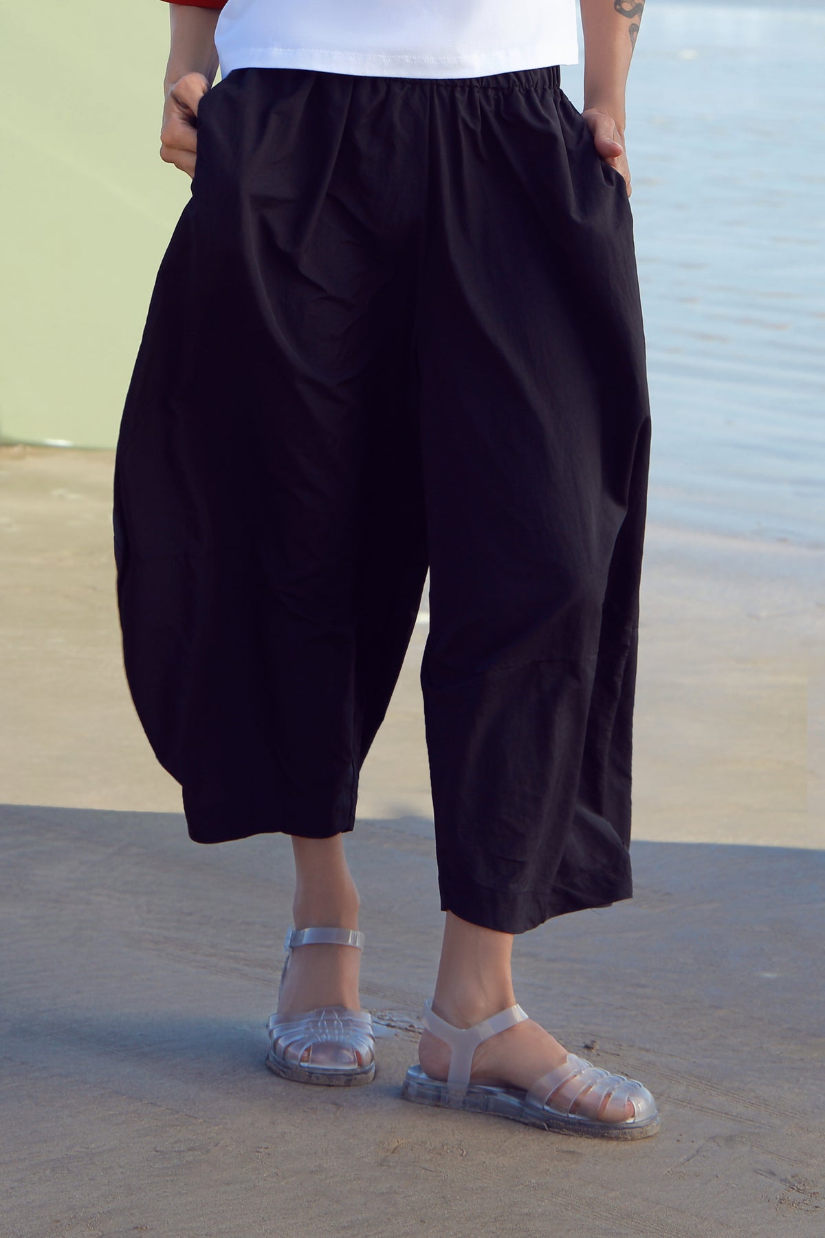 Barrel shape trousers in cotton blend fabrication, featuring elasticated waist belt and wide leg hem
