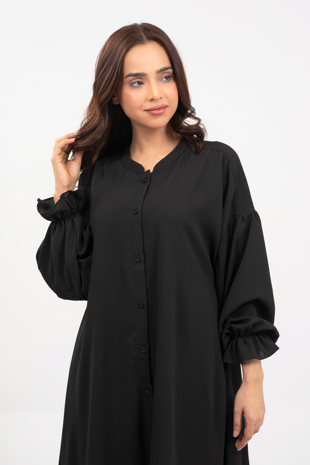 Co-ord set in georgette fabrication, featuring long length button down shirt and wide leg trousers