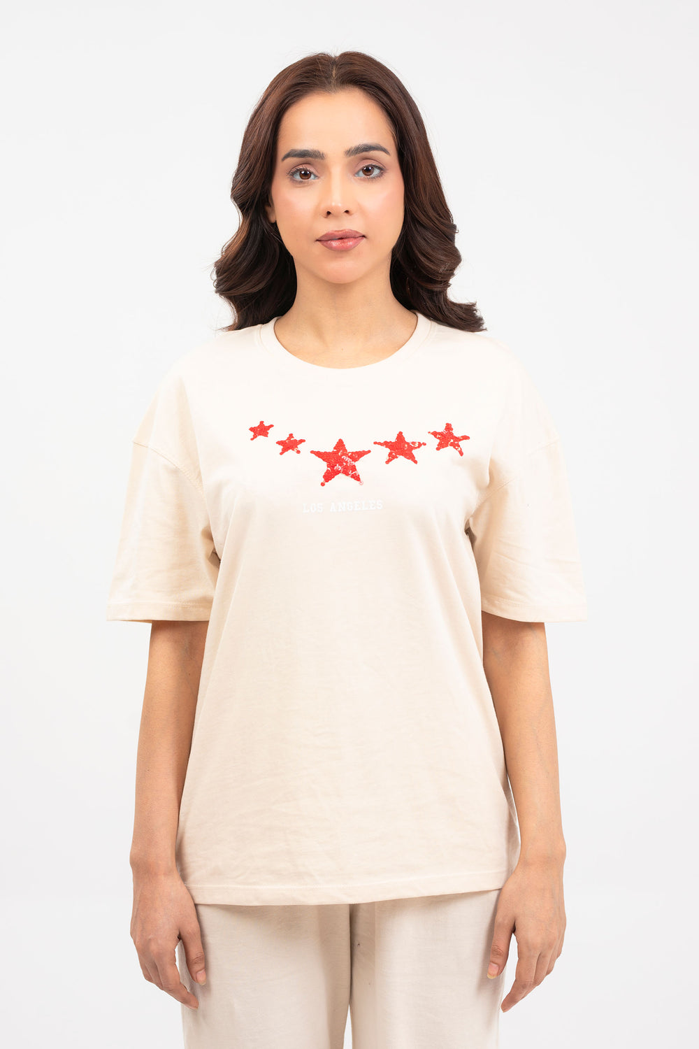 Drop shoulder tee shirt in jersey fabrication, featuring round neck and short sleeves with sequins in front