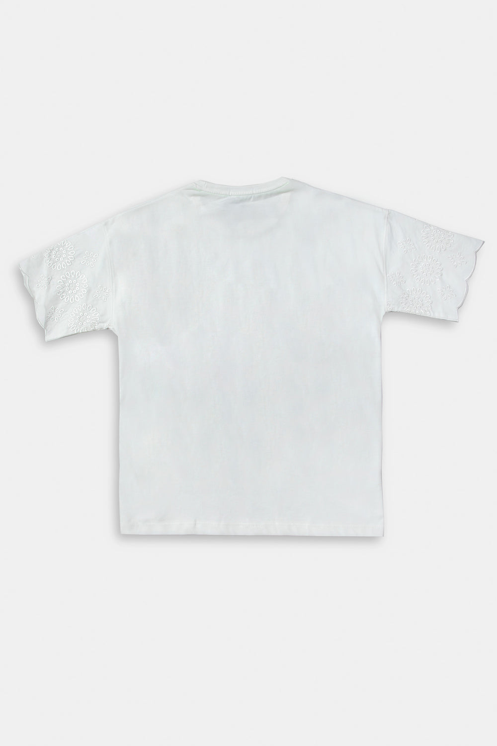 Drop shoulder tee shirt in jersey fabrication, featuring round neck and short sleeves in embroidered fabrication