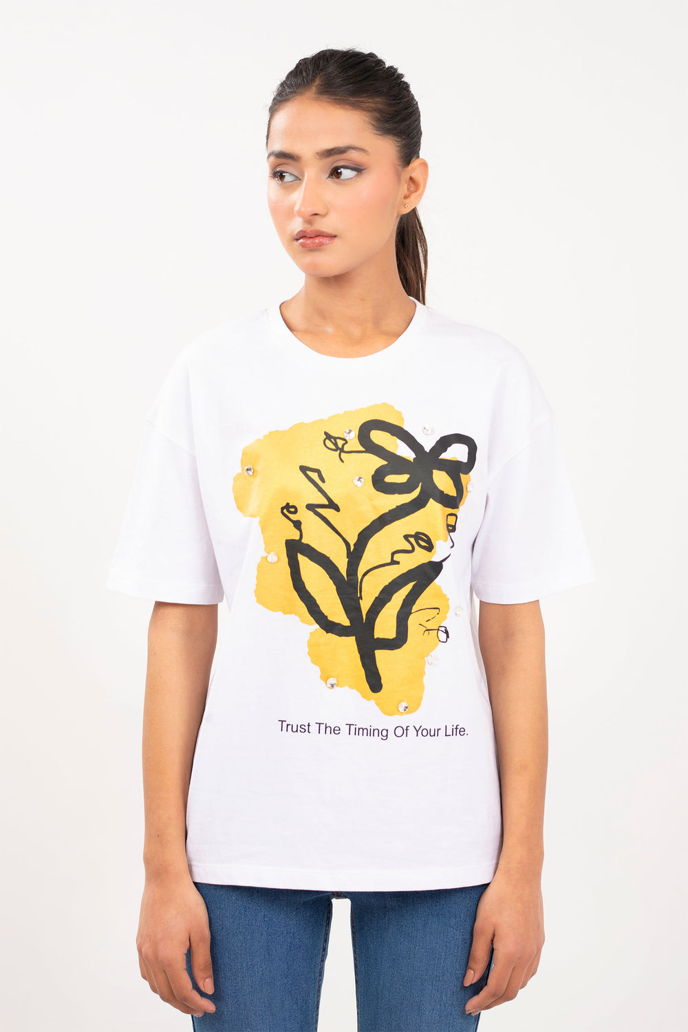 Drop shoulder tee shirt in jersey fabrication, featuring round neck and short sleeves with print and embellishment in front