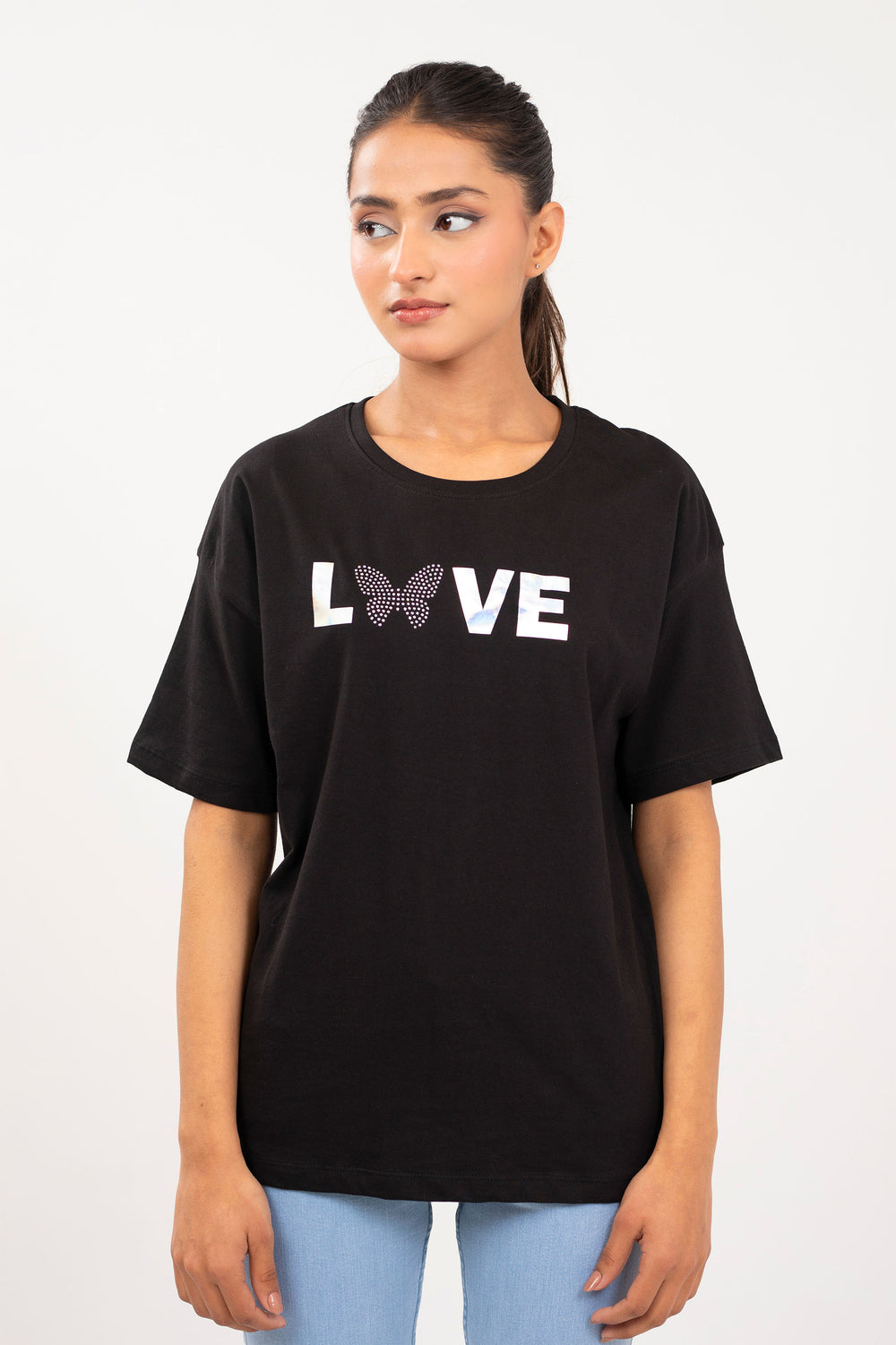 Drop shoulder tee shirt in jersey fabrication, featuring round neck and short sleeves with print and embellishment in front