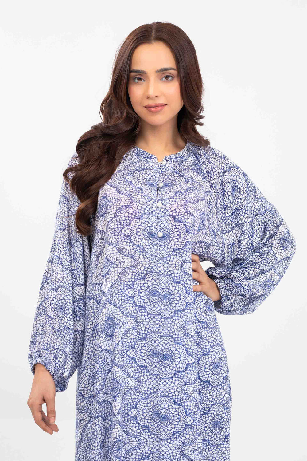 A-line long shirt in printed cotton blend fabrication, featuring ban collar with buttoned placket in front and volumnous sleeves