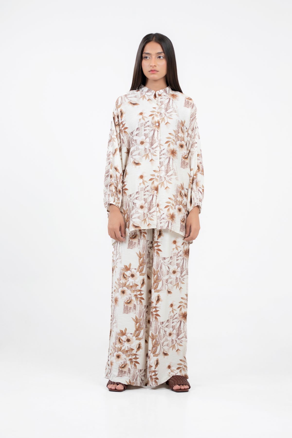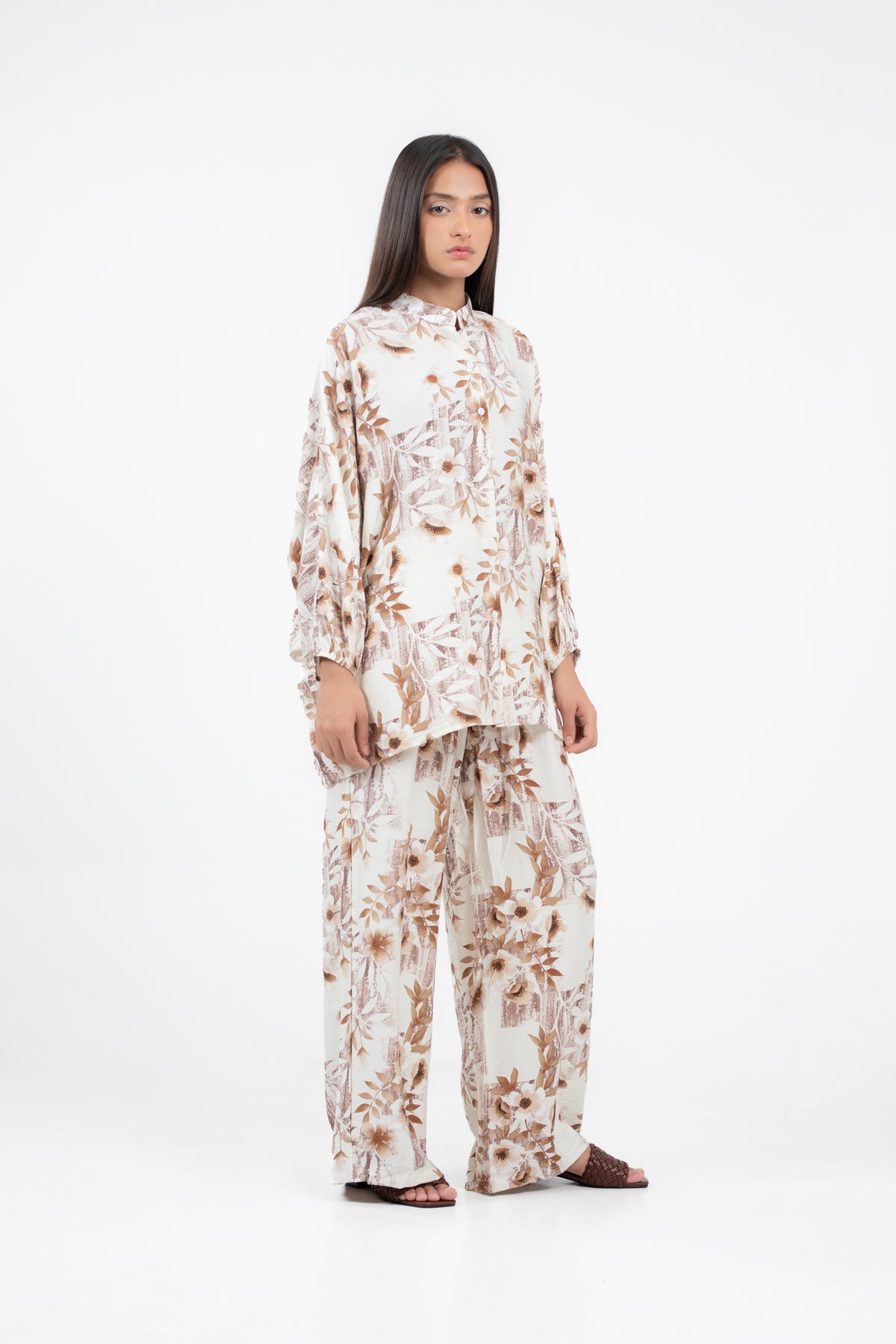 2-piece co-ord set in printed cotton blend fabrication, featuring kimono sleeve button down shirt with wide leg trousers