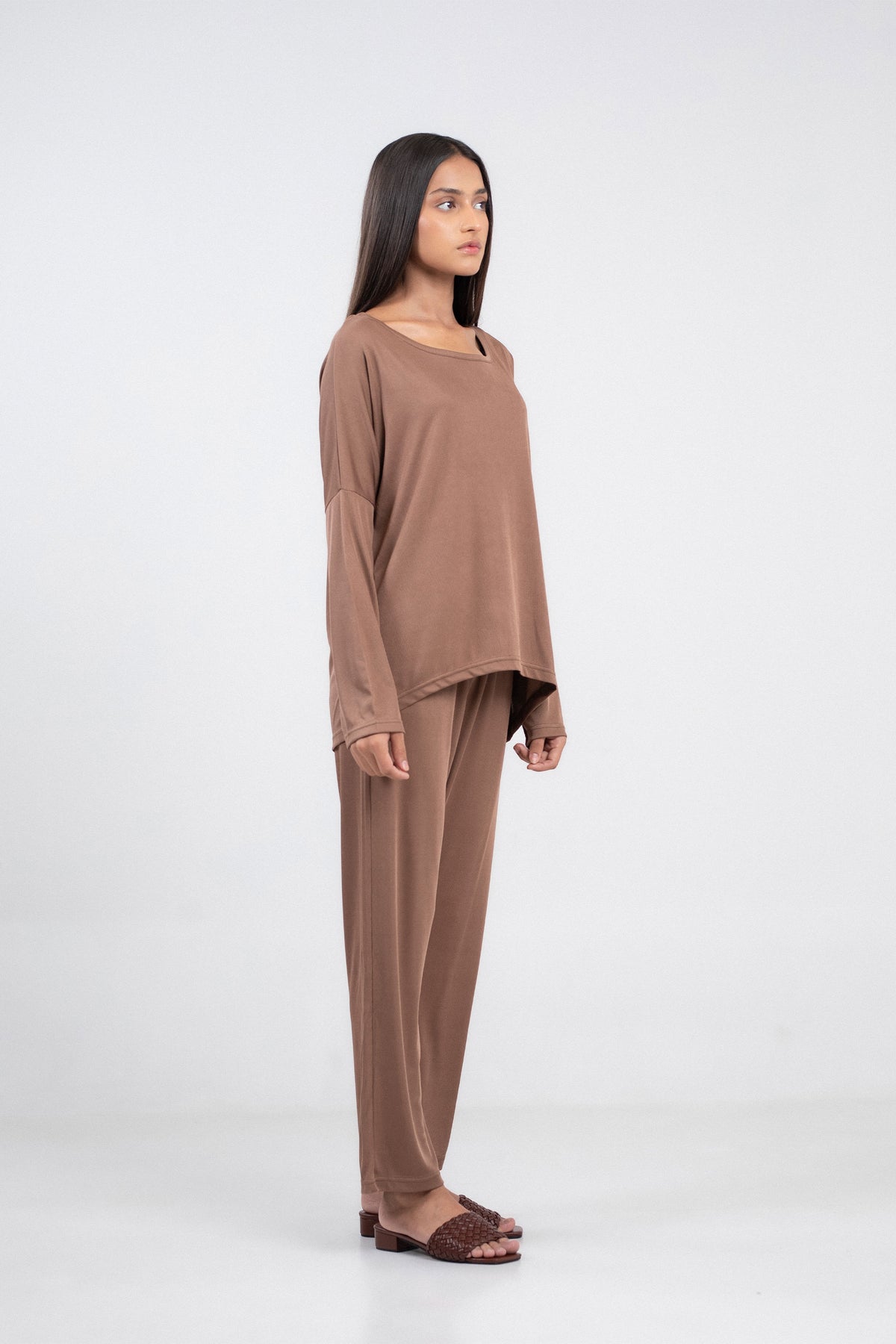 2-piece co-ord set in rib fabrication, featuring long sleeve tee shirt and straight leg trousers