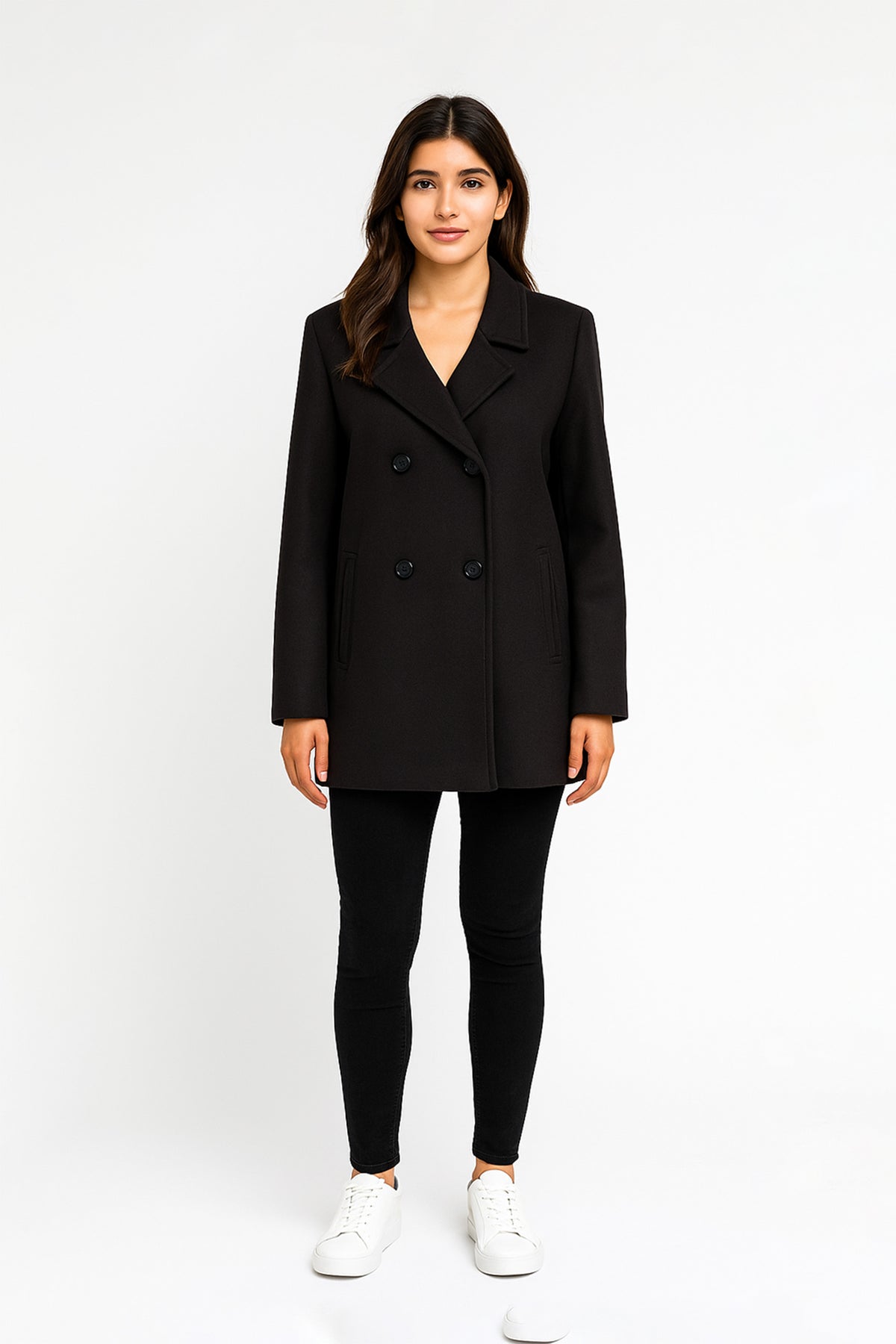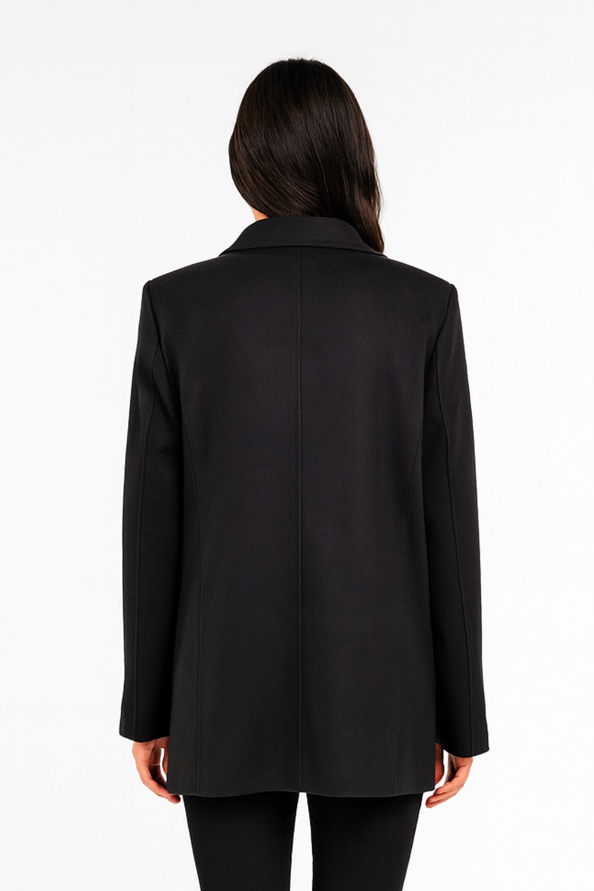 Classic style long coat in felt material, featuring notch collar with double breast closure