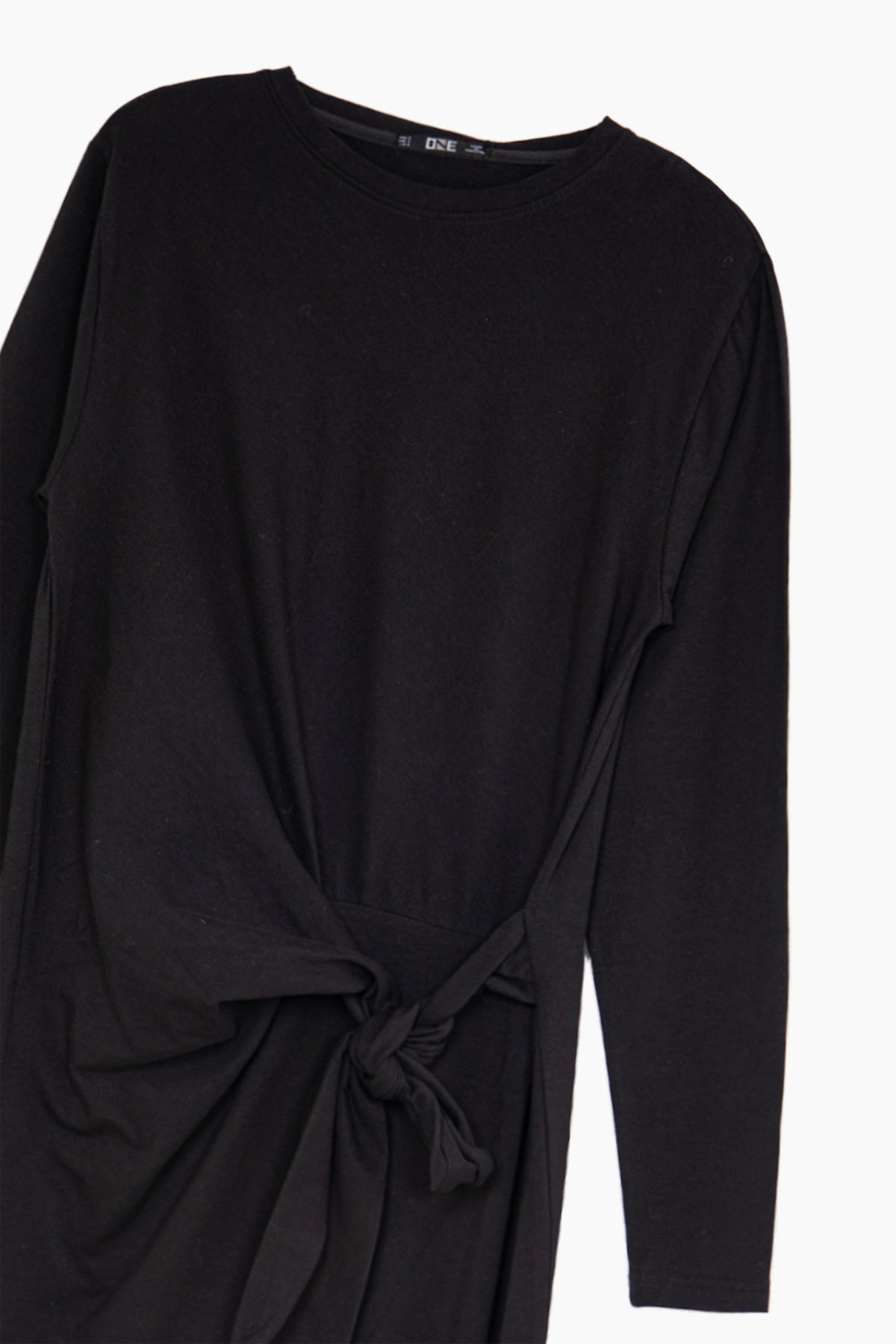 Crew neck dress in lurex jersey, featuring long sleeves and tie up detailing in front with side slit