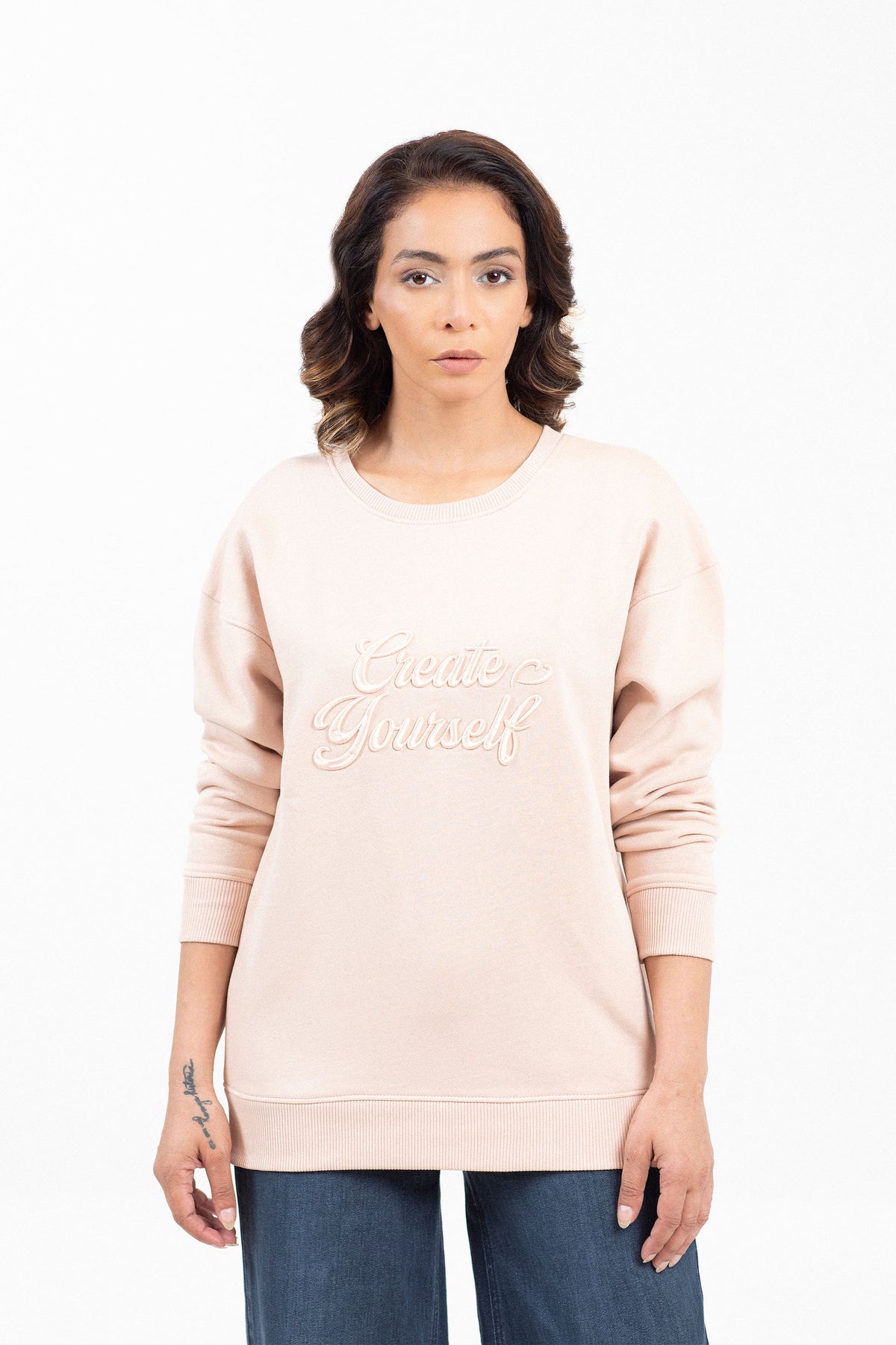 Baggy fit drop shoulder sweatshirt in fleece fabrication, featuring crew neck and puff embroidery in front