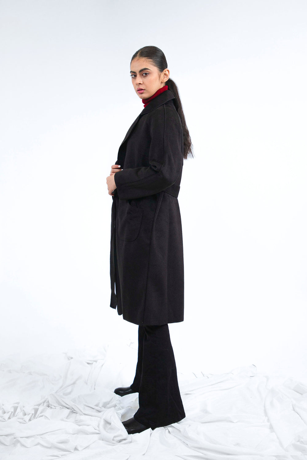 Long coat in blended fabrication, featuring notch collar, pockets and self fabric tie up waist belt
