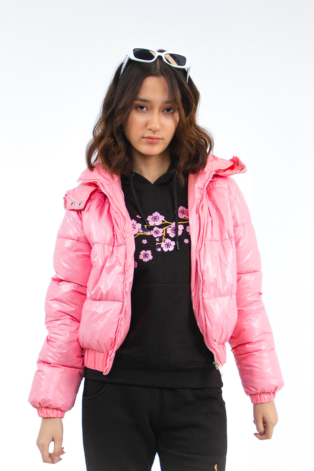 Short length puffer jacket in polyester fabrication, featuring hood and full front zip in front