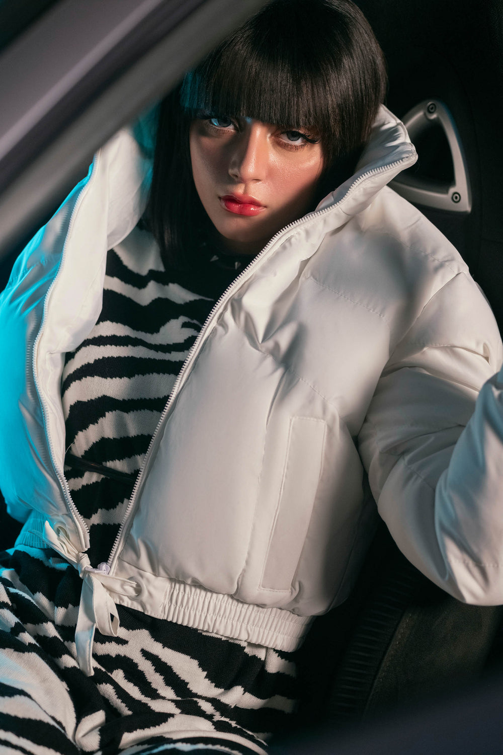 Short length puffer jacket in polyester fabrication, featuring high neck and full front zip in front