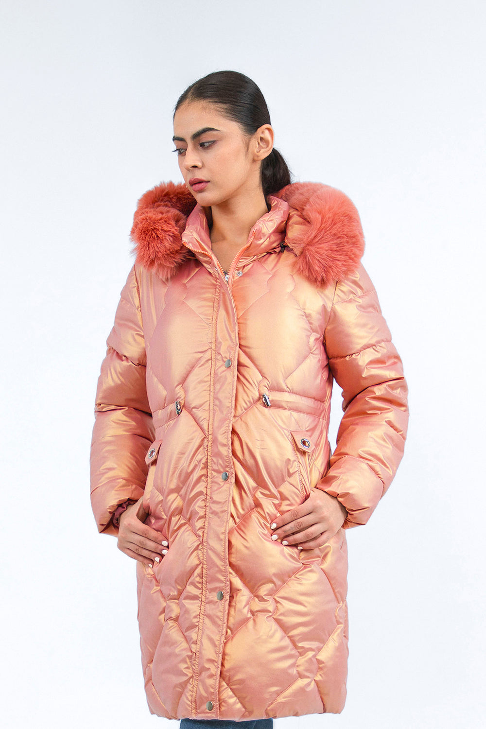 Long length puffer jacket in polyester fabrication, featuring faux-fur trimmed hood and full front zip in front