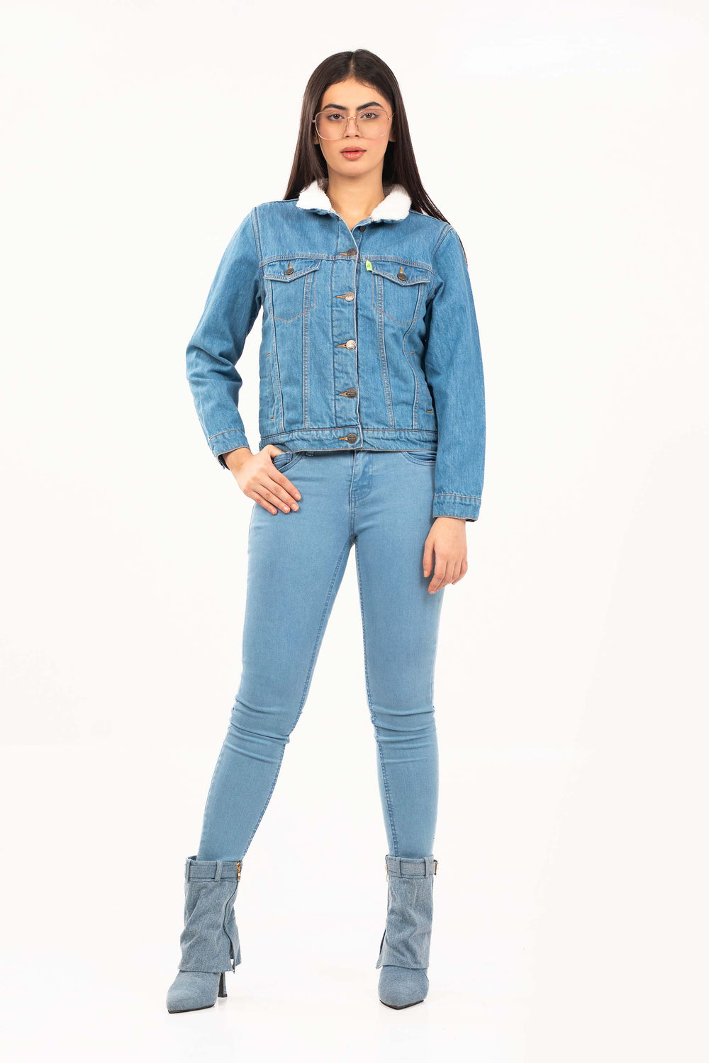 Basic denim jacket, featuring front buttoned placket, pockets, pannels and sherpa lining with collar