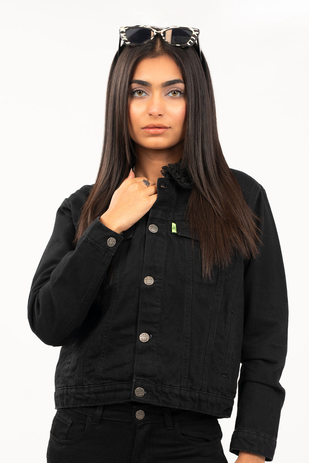 Basic denim jacket, featuring front buttoned placket, pockets, pannels and sherpa lining with collar