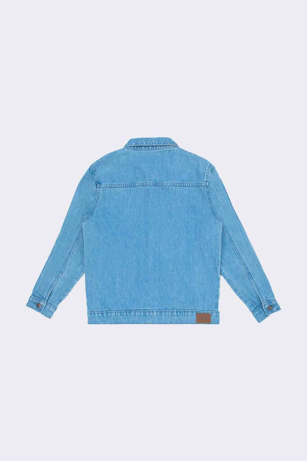 Regular length denim jacket, featuring front buttoned placket, stripe detailing on sleeves and metallic print in front & back