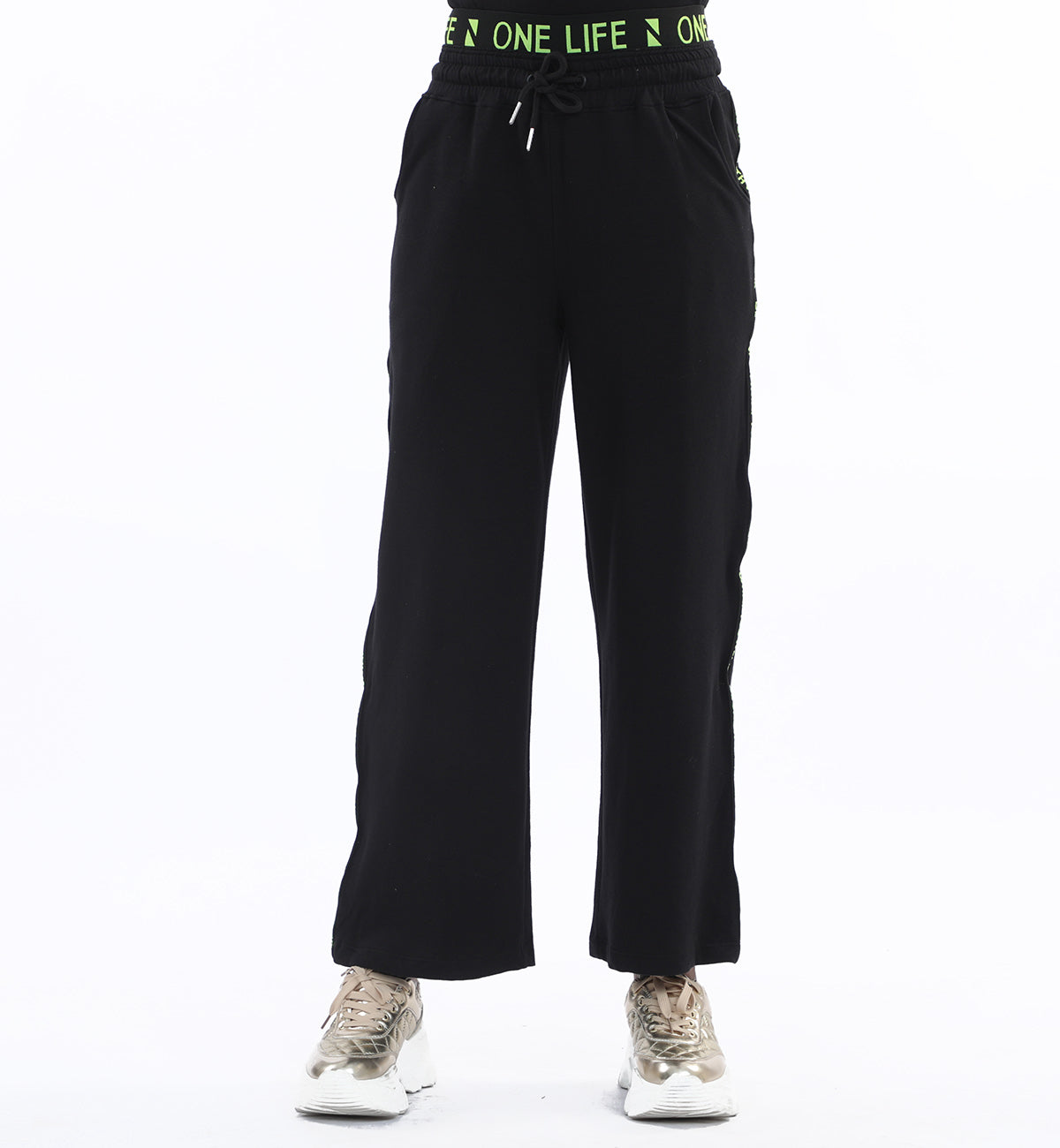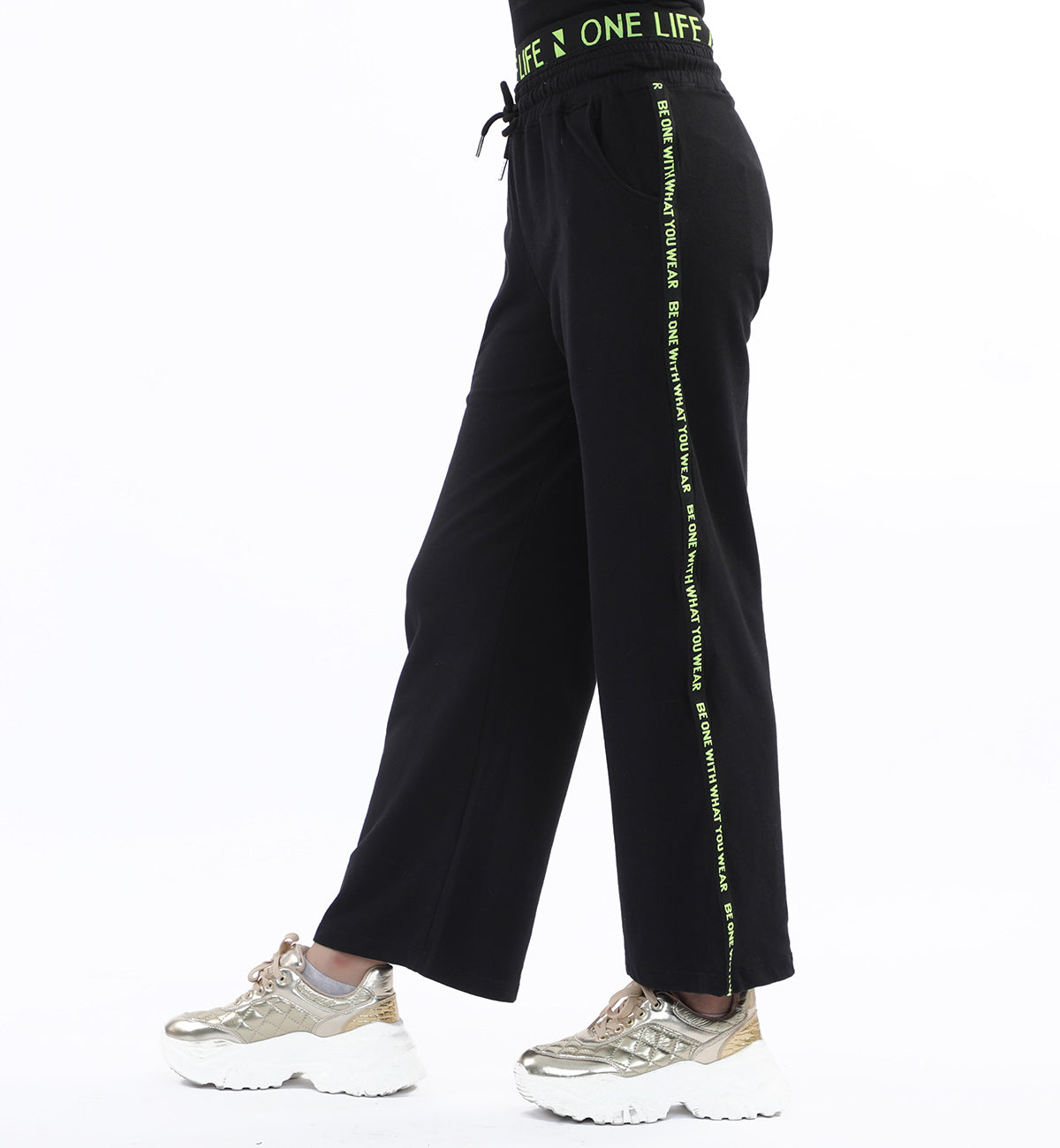 Wide leg trousers in terry fabrication, featuring jacquard rib detailing at waist and side tape detailing on legs