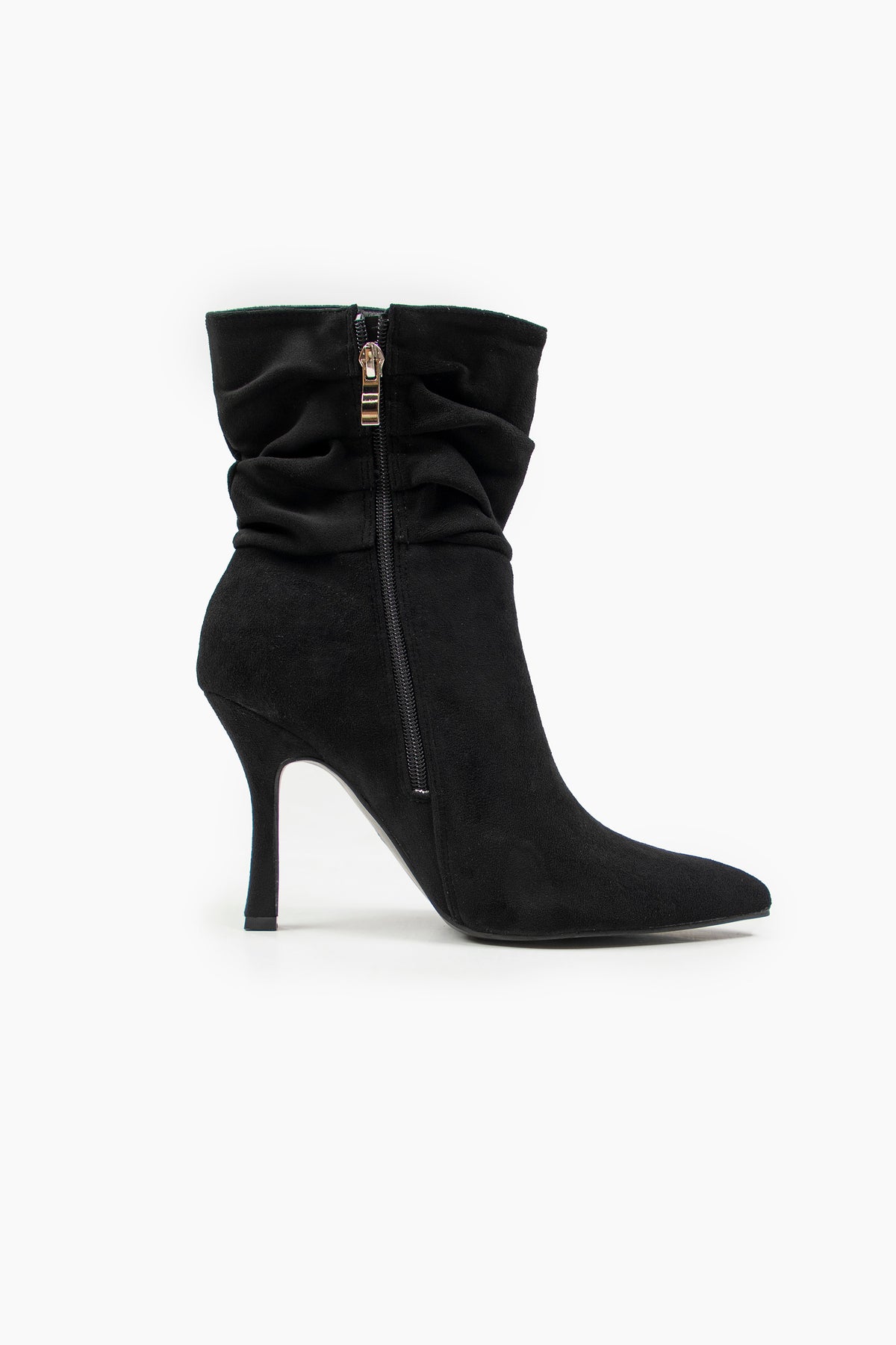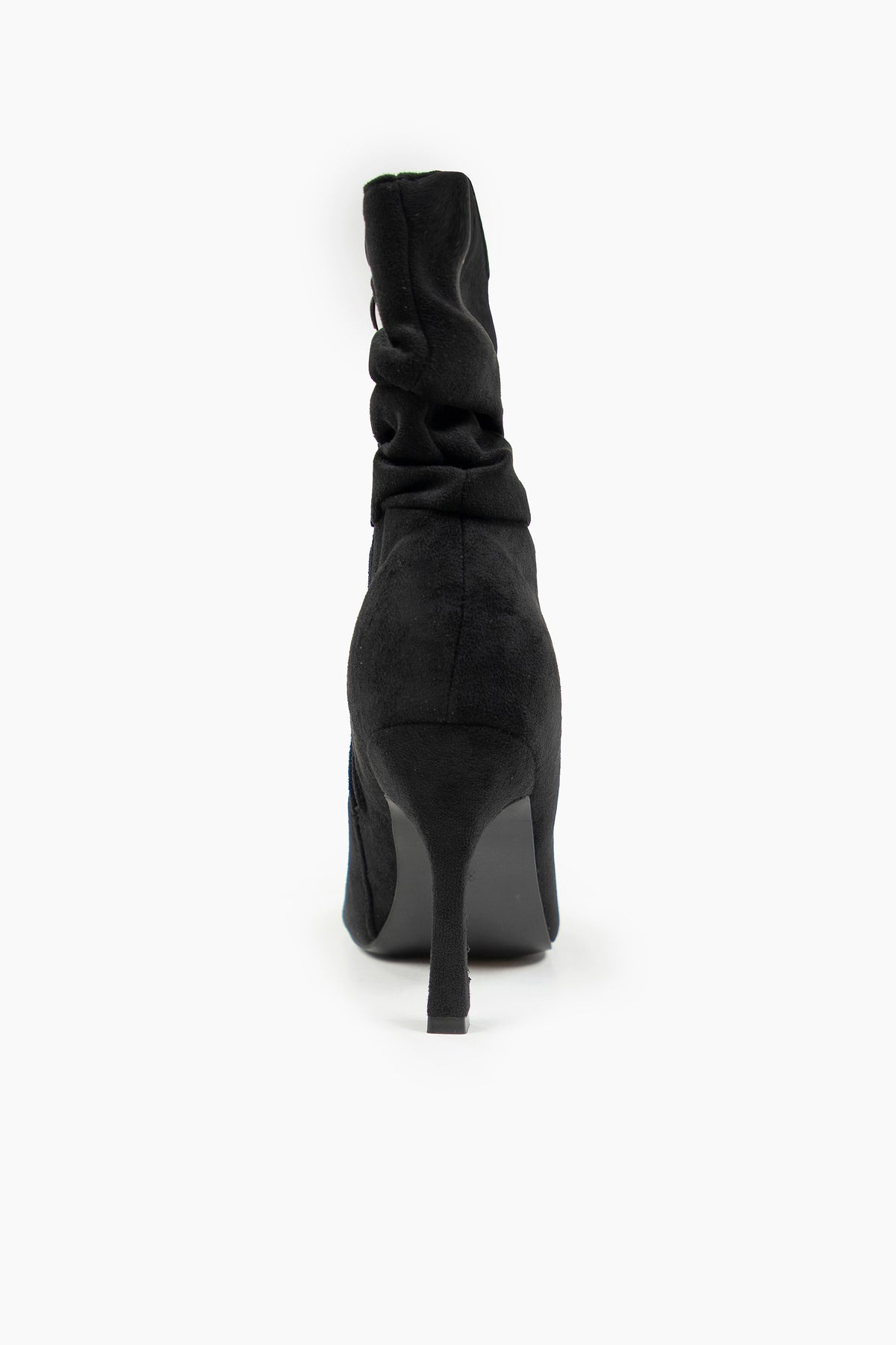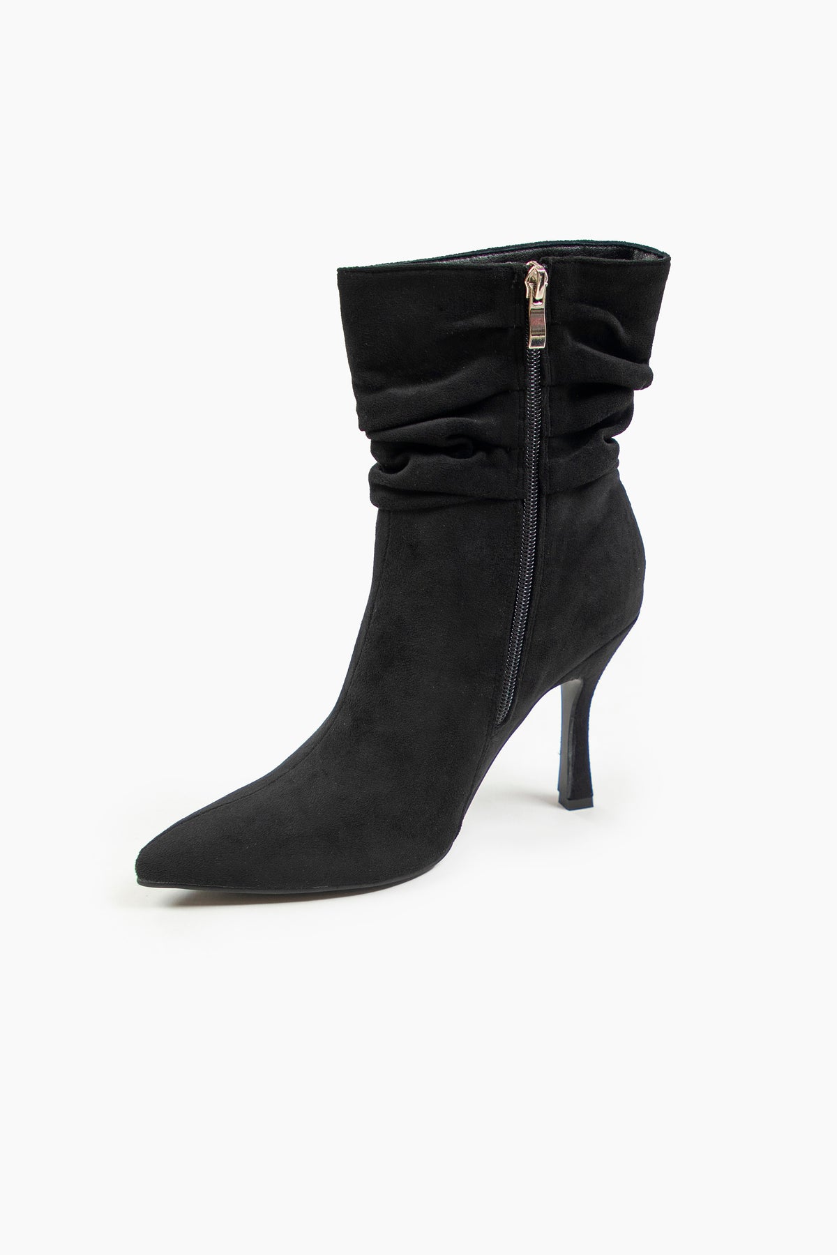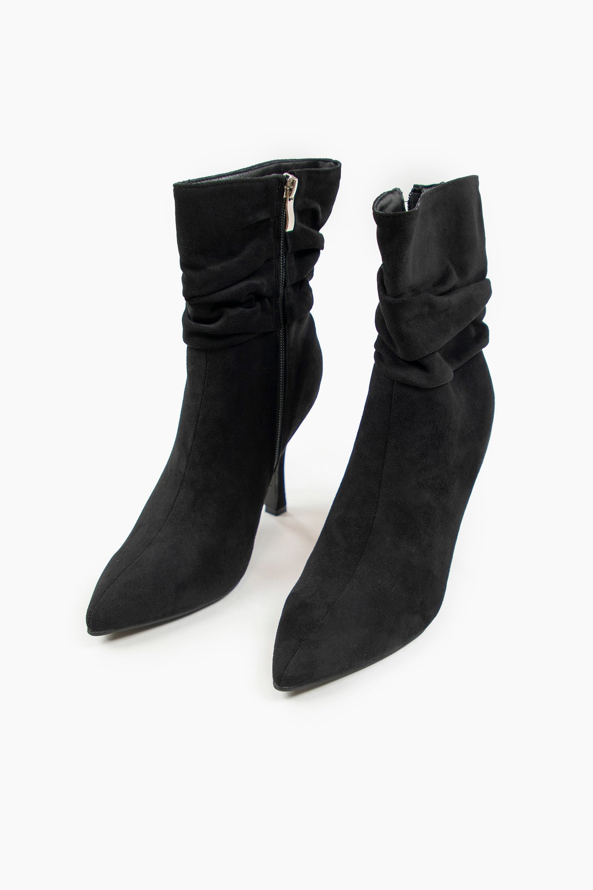 Faux Suede long boot, featuring pointed toe, gathered detail and side zip opening