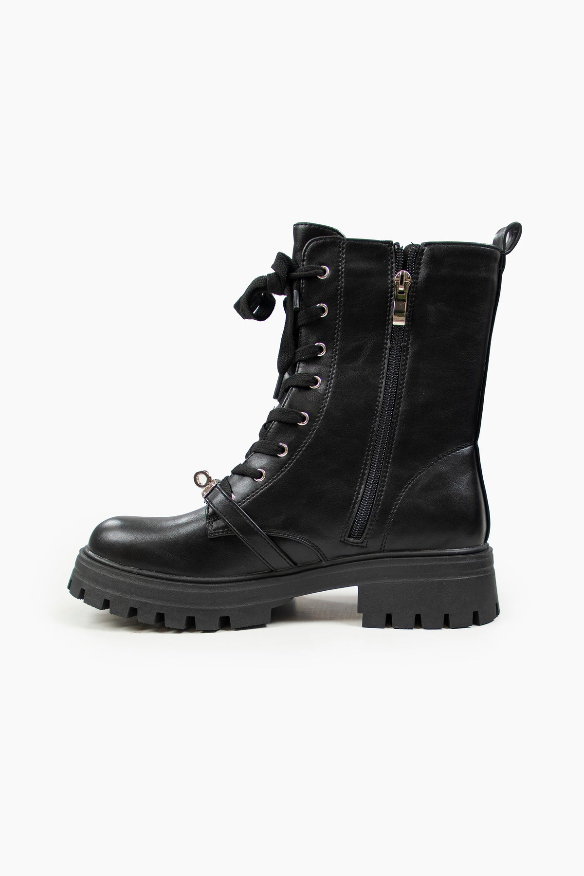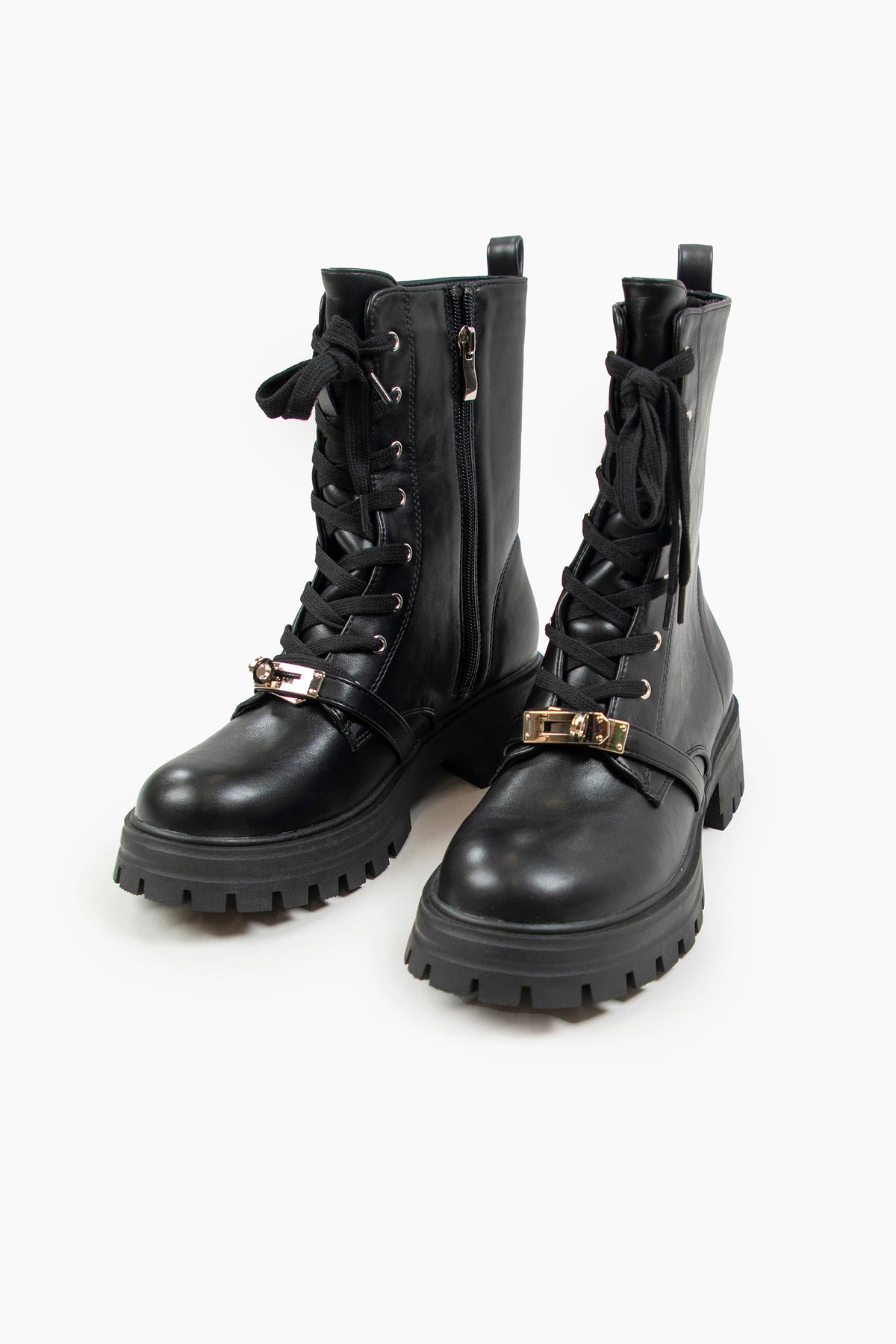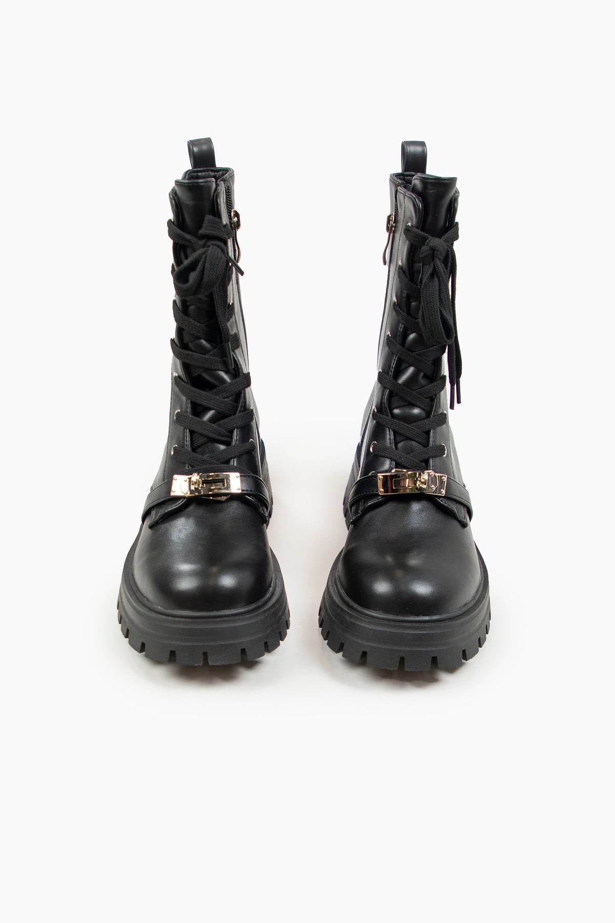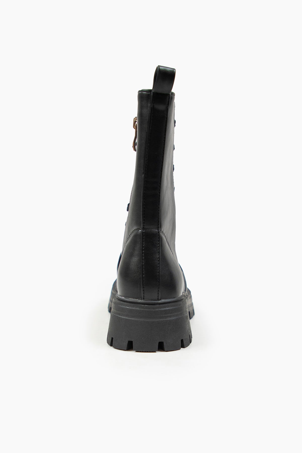 Faux leather combat long boot, featuring eyelets and lace detailing