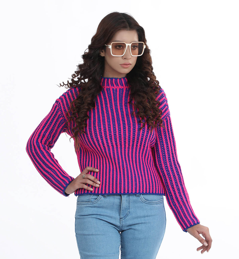 Round neck sweater in two tones blended knit, featuring drop shoulders