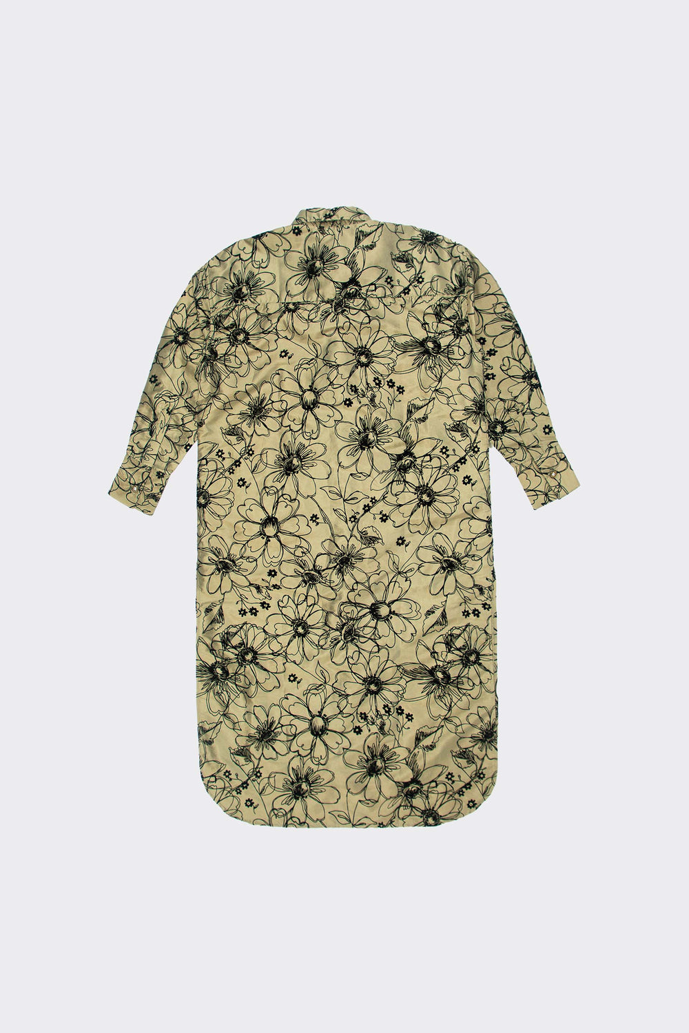 Long button down shirt in printed silk blend fabrication, featuring collar and full front buttoned placket