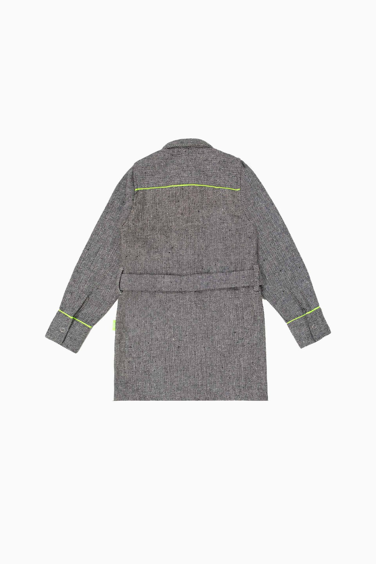 Coat like top in textured fabrication, featuring neon detailing and front buttoned placket with self fabric tie up waist belt