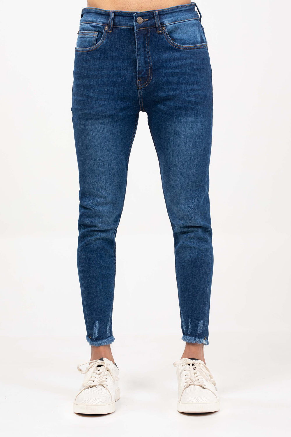 Cropped tapered fit jeans in denim fabrication, featuring five pockets, front fly opening and wash effect with ragging